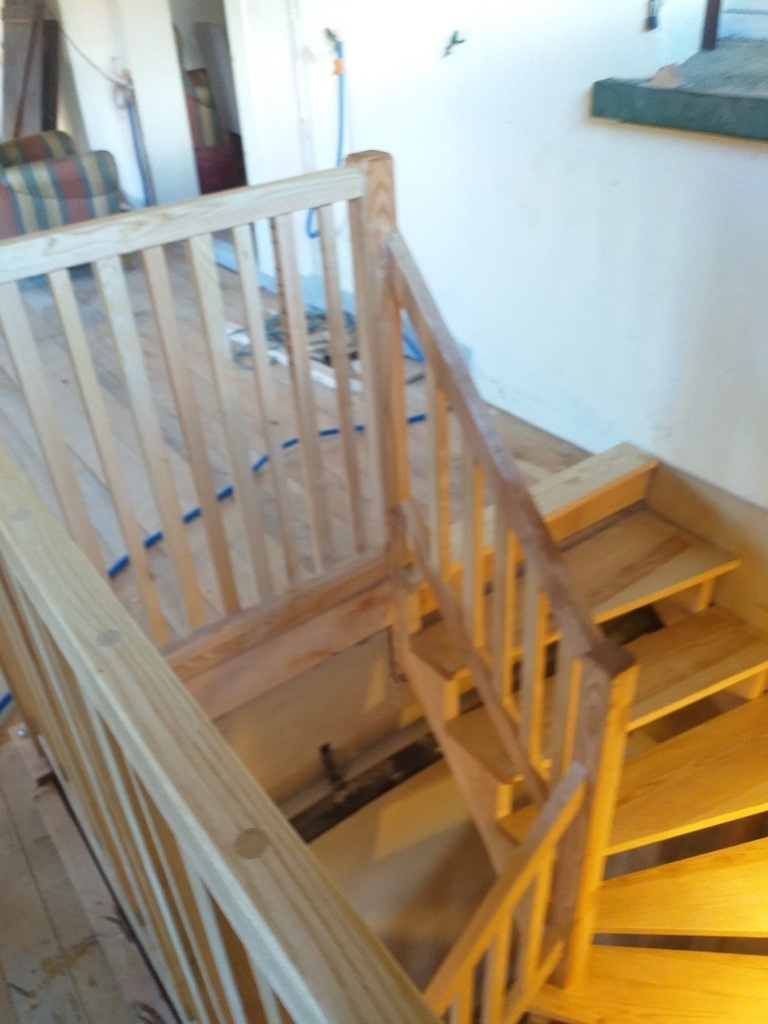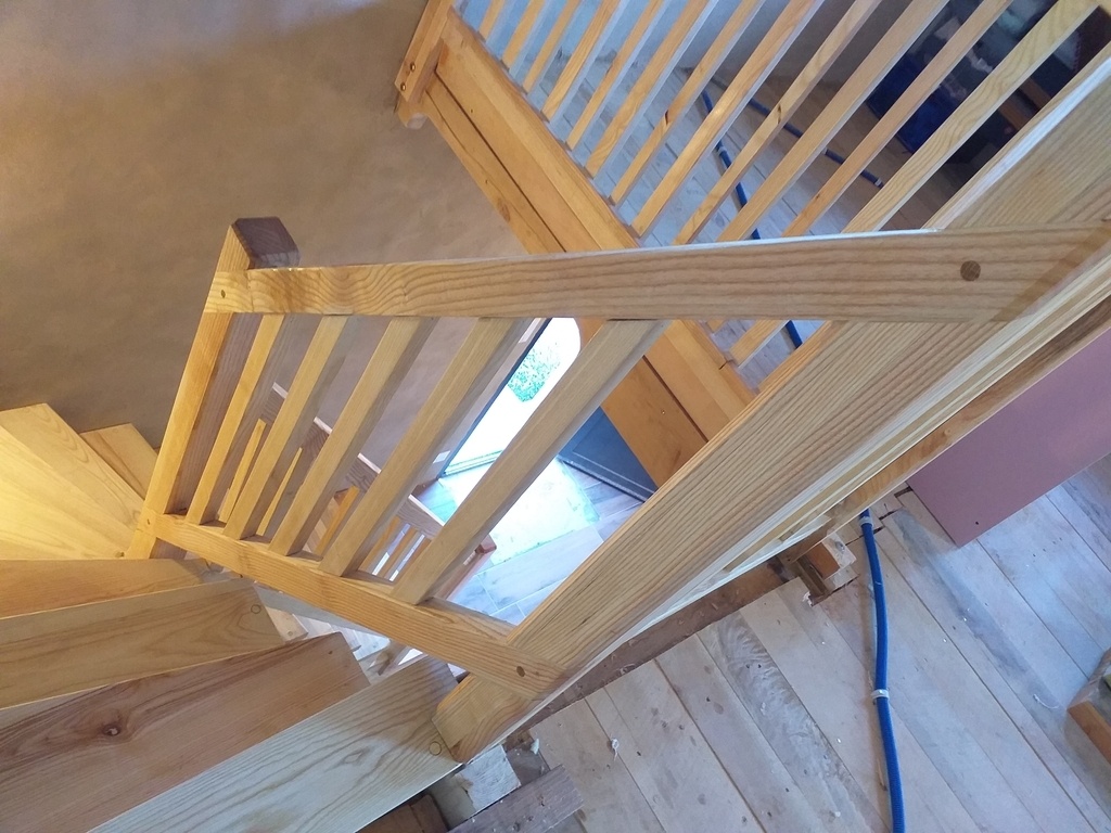 Quart tournant en frêne massif, balustre assemblée au domino et la dernières en mi-bois (j'ai bien aimé cette option solide et facilitant le montage).