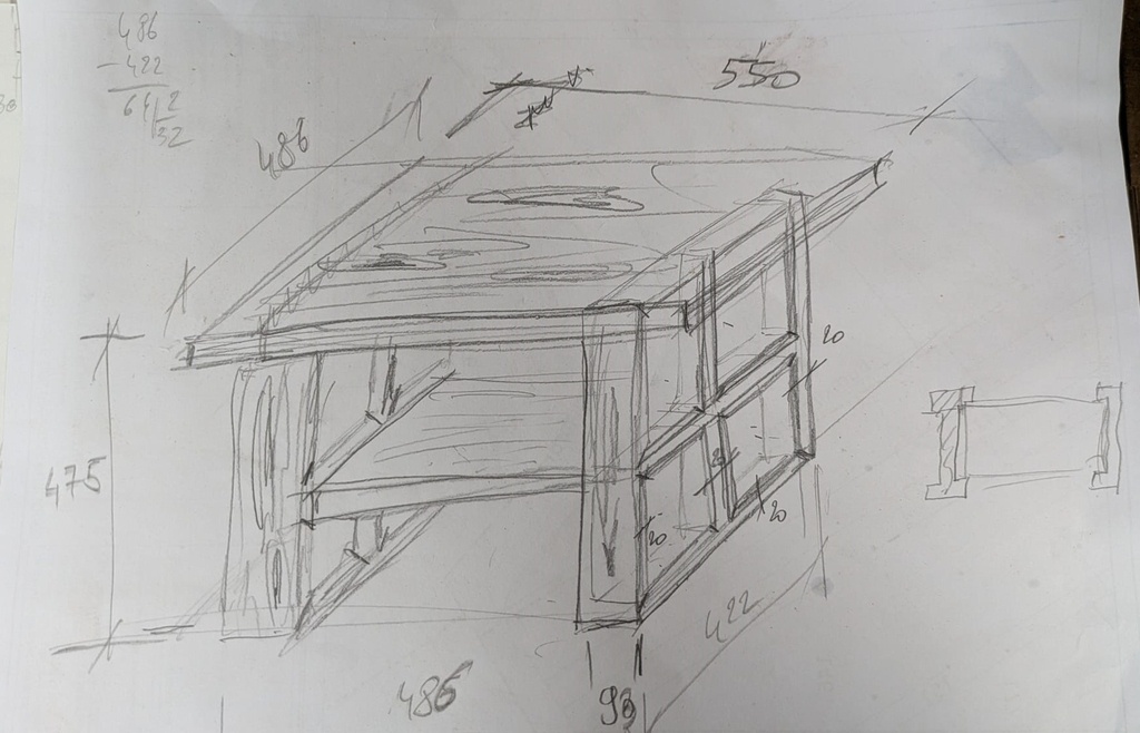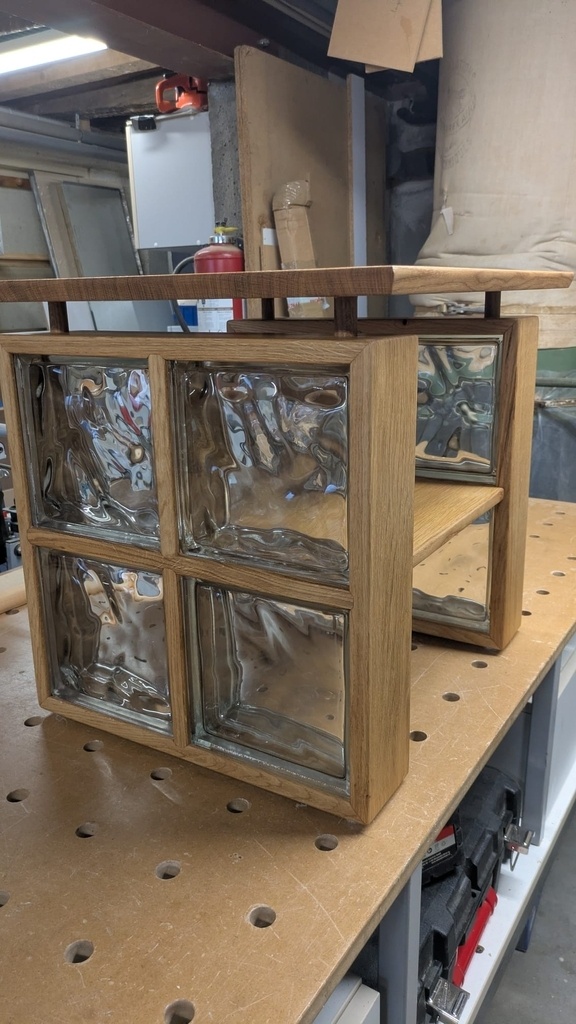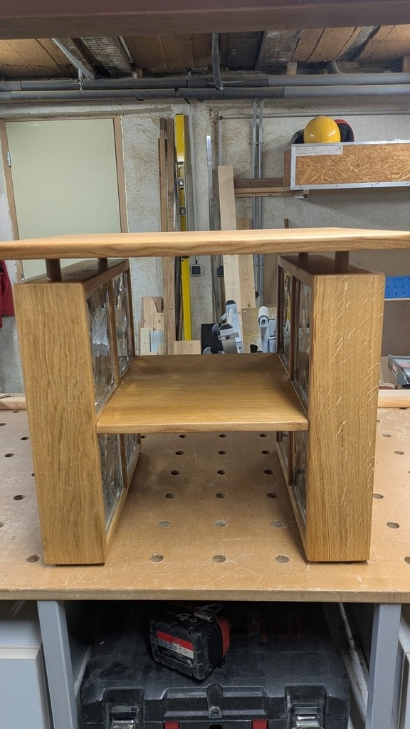 Ma fille, ayant vu une création en blocs de verre sur Pinterest, m’a sollicité pour lui fabriquer un petit meuble servant de table d’appoint. J’ai donc réfléchi à la manière de mettre en œuvre ces différents carreaux. J’ai fabriqué des profils en chêne permettant d’insérer les carreaux de verre. L’ouvrage est en chêne et les plans ont été imaginés par mes soins, je n'ai pas pris le temps de créer des plans numérisés 3D (Topsolid). La finition consiste simplement en l’application d’une monocouche d’huile Rubio Monocoat.