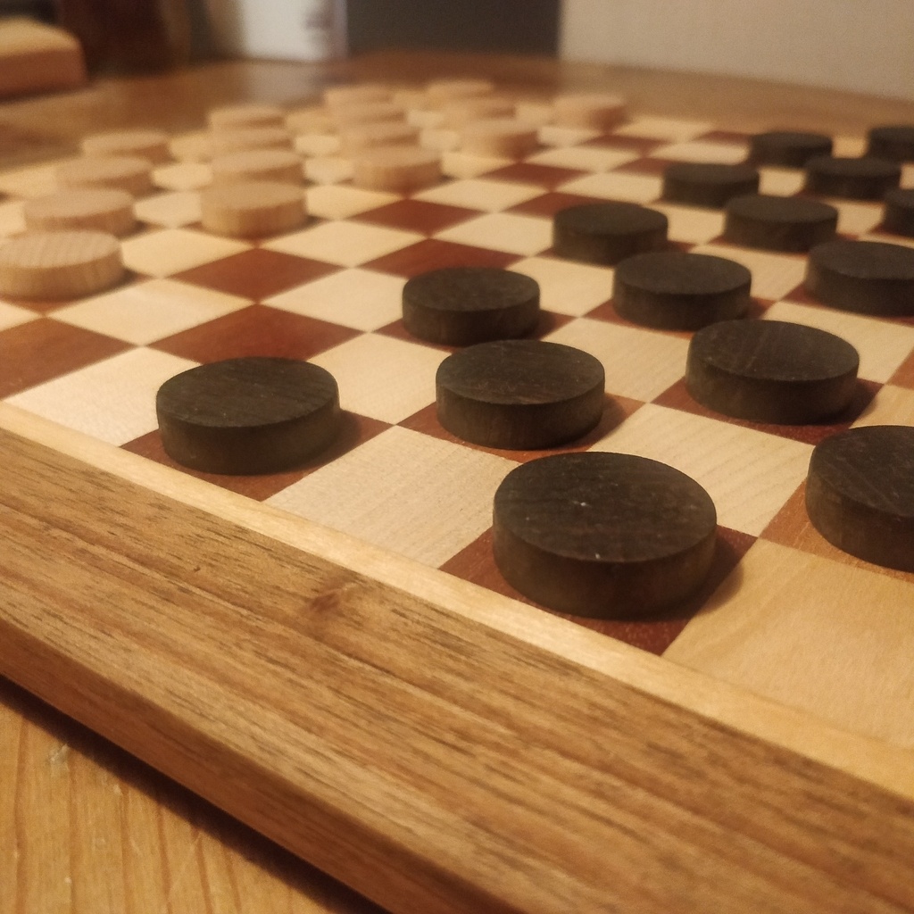 Les pions ont été réalisés en hêtre et teintés pour la moitié (teinte wengé).
