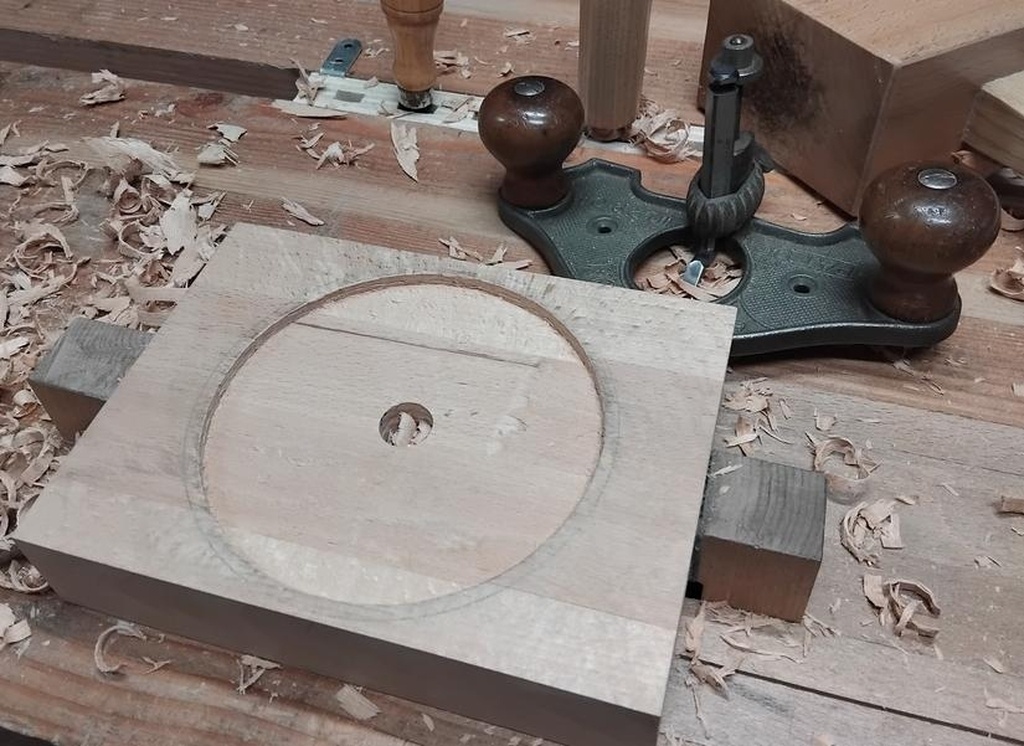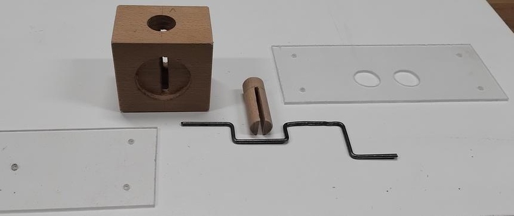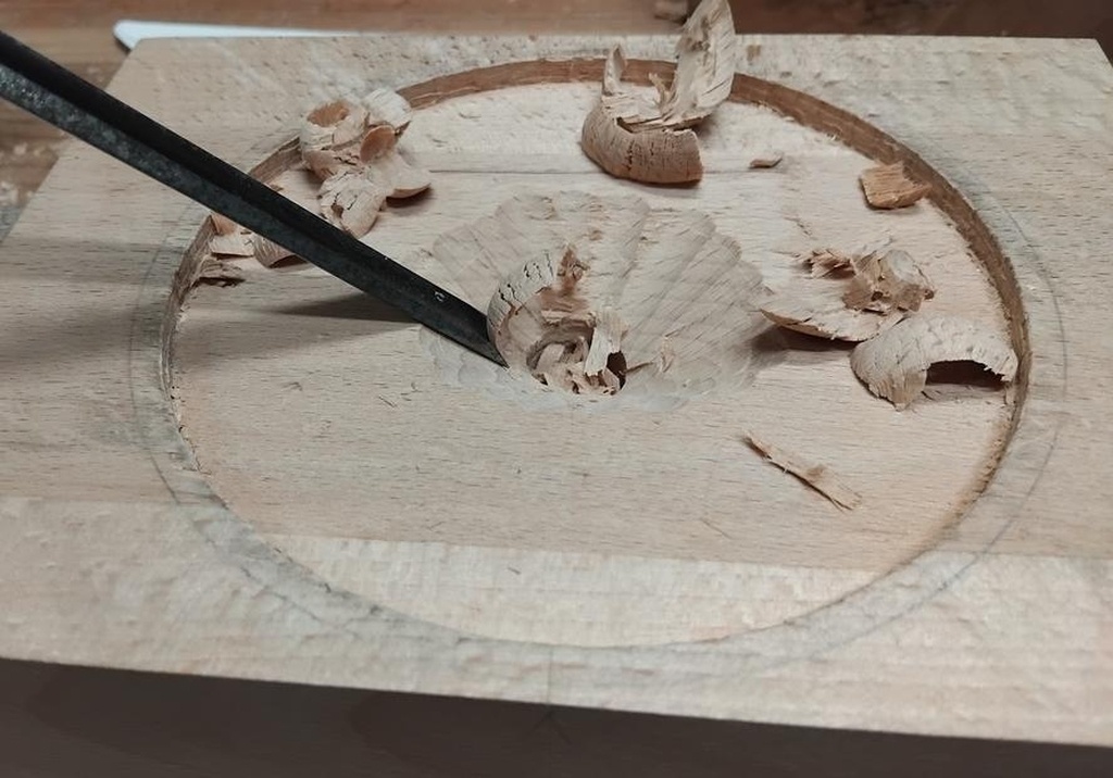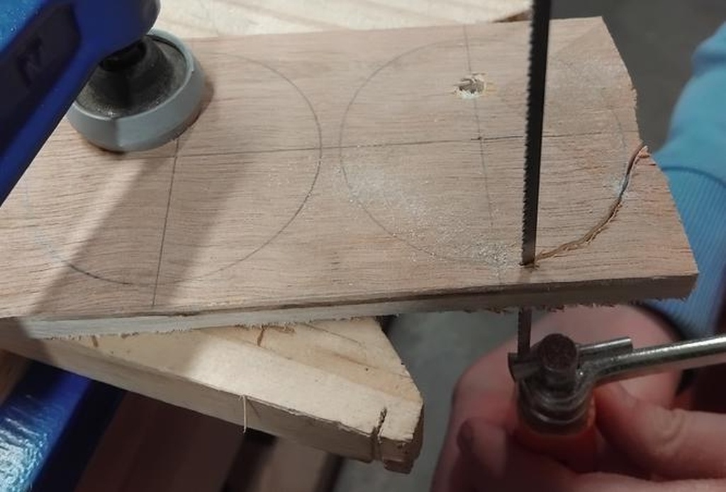 Il faut d'abord percer un trou de 18 mm en biais dans un bloc de bois, puis le découper.