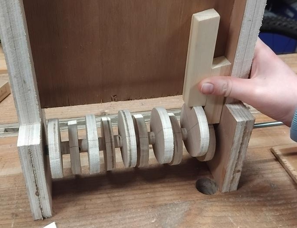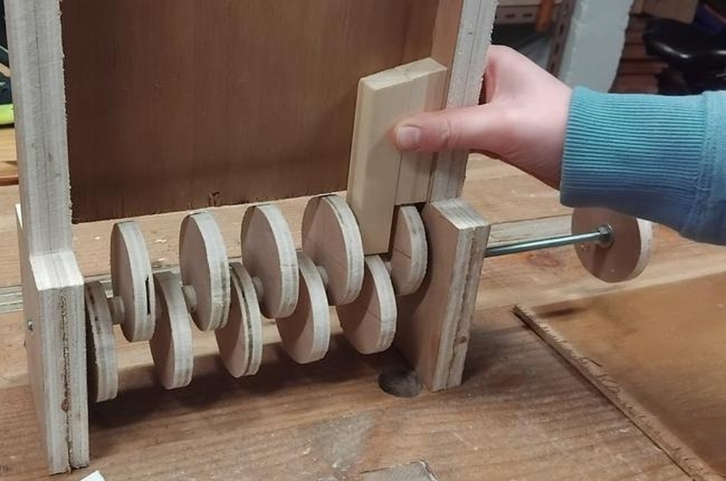 Le principe est de transformer le mouvement circulaire de la manivelle en mouvement linéaire, à l'aide de cames.