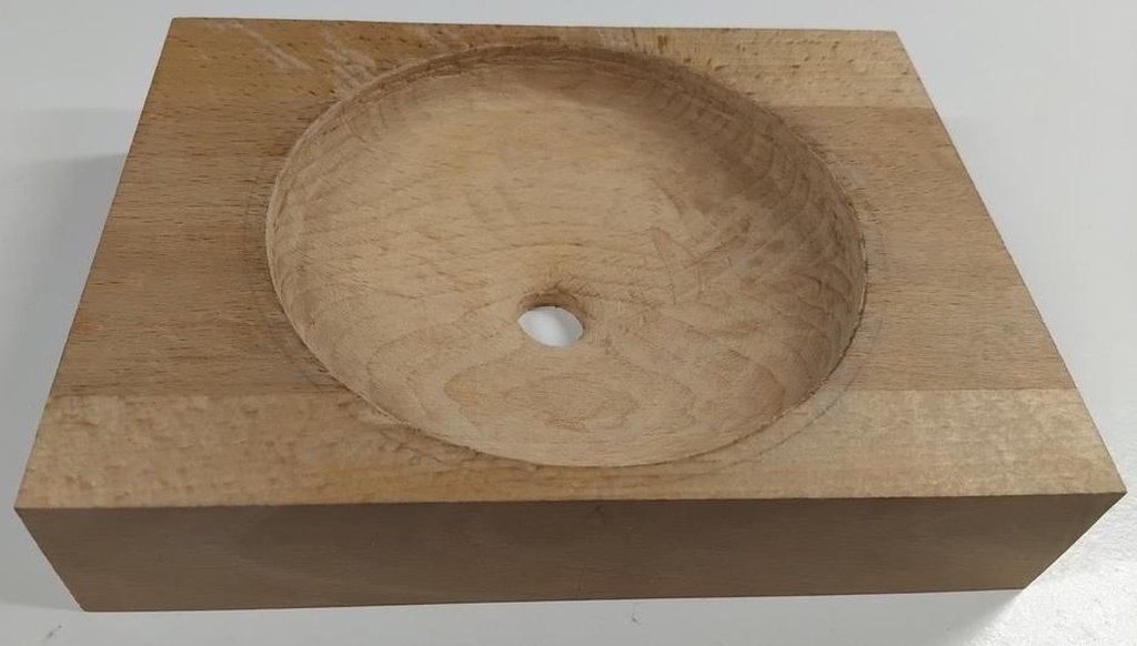 Il est creusé dans un bloc en hêtre de 4 cm d'épaisseur (chute de plan de travail). Contrairement à un entonnoir classique, où la pente est forte pour que les liquides s'écoulent rapidement, ici la pente est faible pour voir les billes tournoyer un moment avant de disparaître.