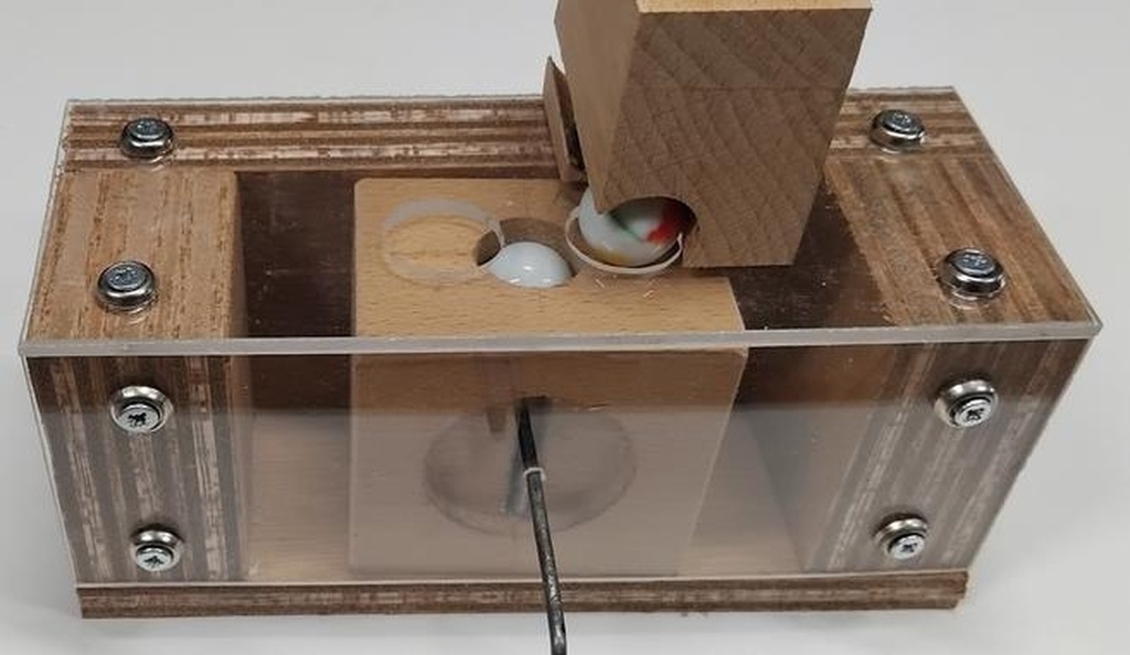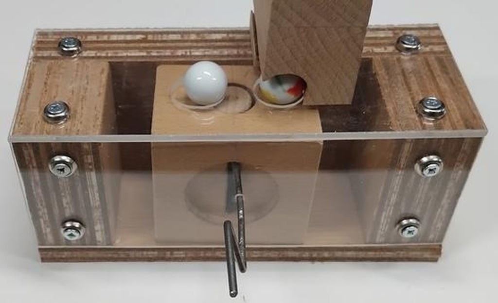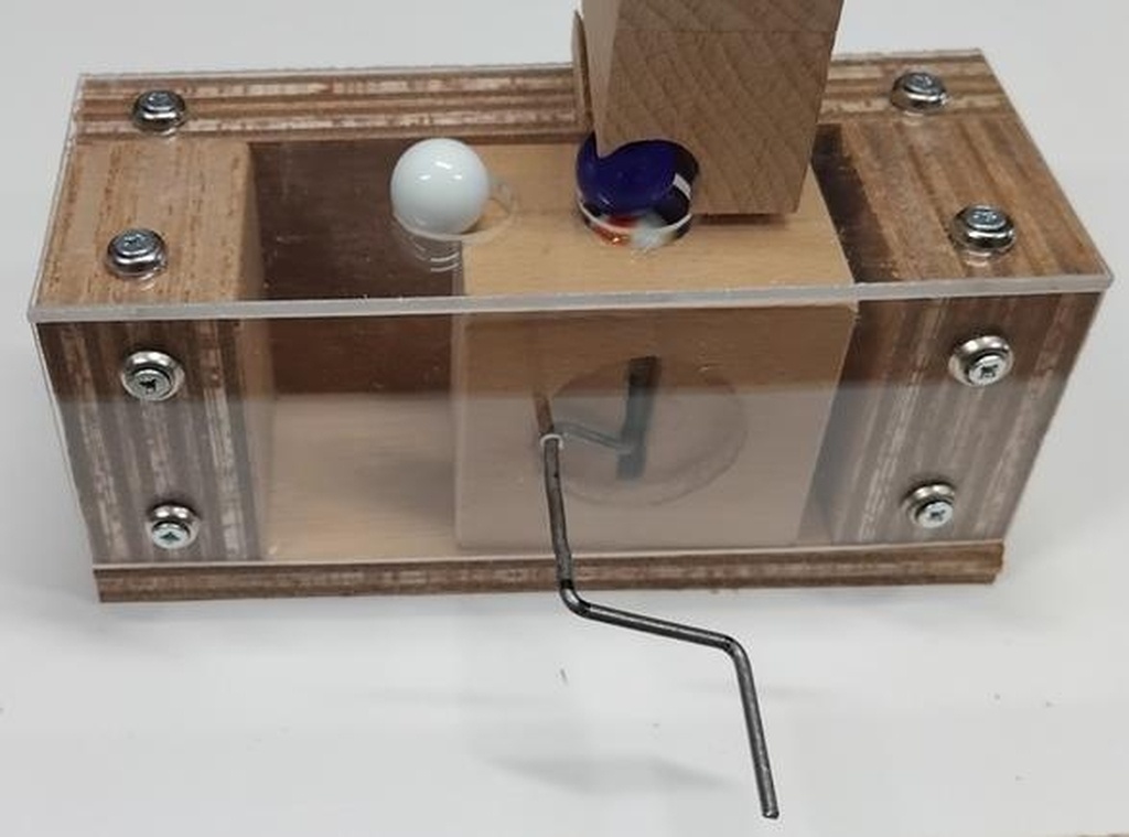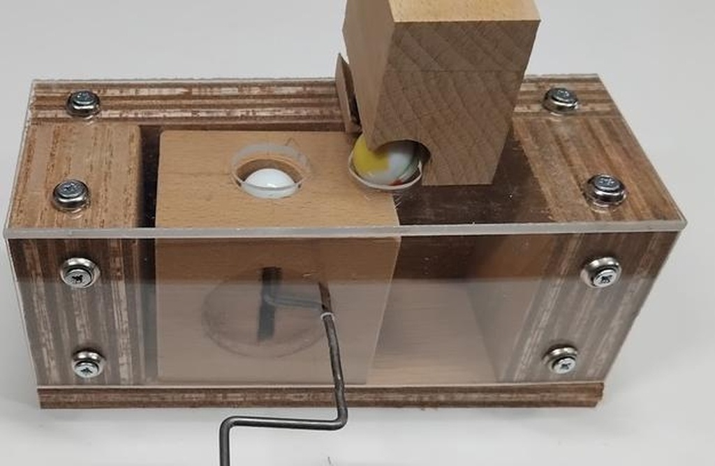 Ici, le principe est de faire venir une bille sur un piston en bois, descendre ce piston, et le déplacer pour faire remonter la bille dans une colonne.