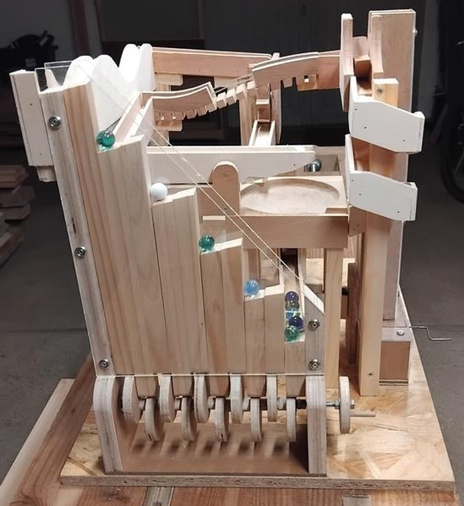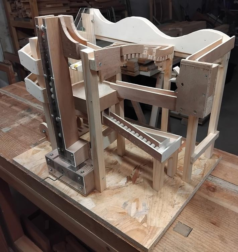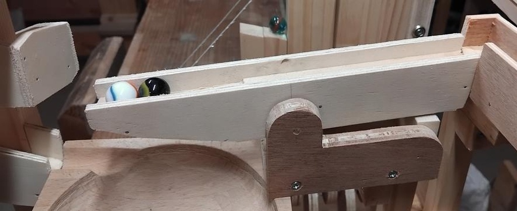 La partie courbe en bas à droite n'était pas là à l'origine, mais lors des essais j'ai constaté que parfois la bille tombée n'avait plus "la force" de pousser la roue pour sortir...