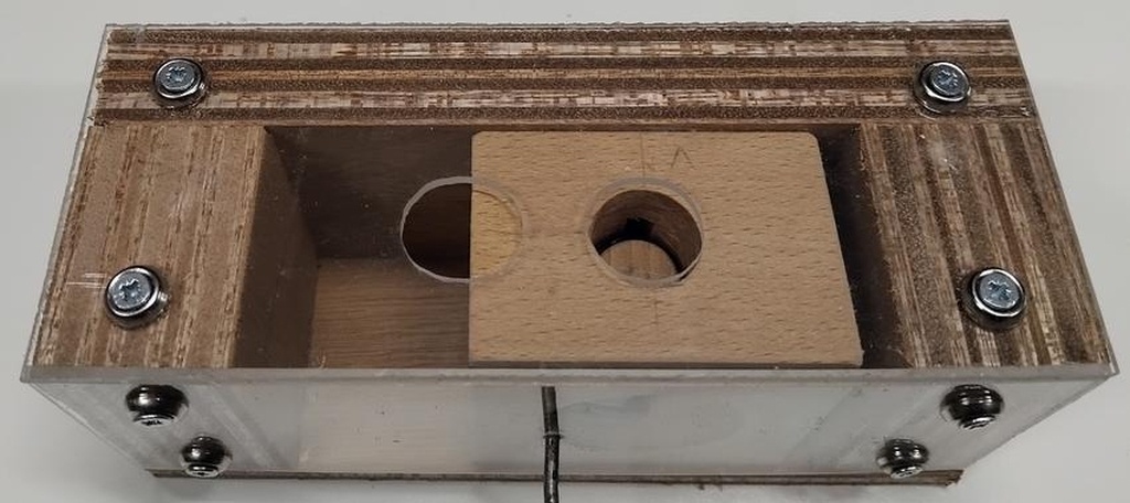 On voit ici que la découpe est faite au ras du trou de 18 mm, car il ne faut pas oublier que ce bloc viendra se placer contre la paroi de la colonne de remontée des billes : l'espacement entre les deux orifices dans le plexiglass correspond à l'épaisseur de cette paroi (en contreplaqué de 10 mm).