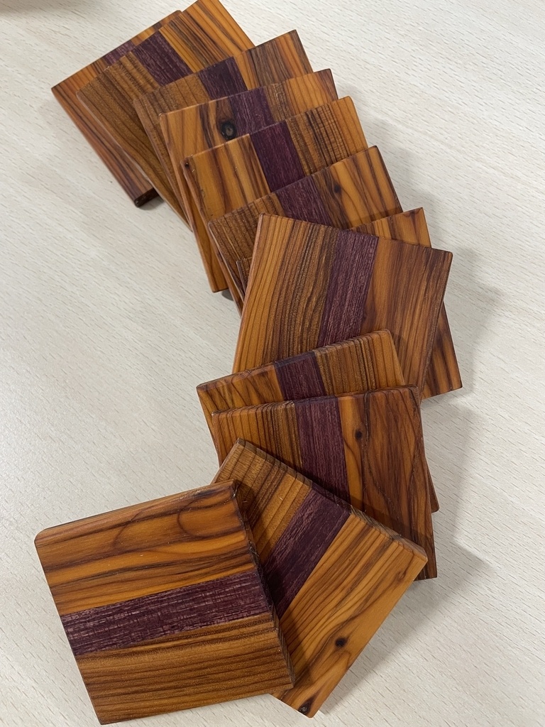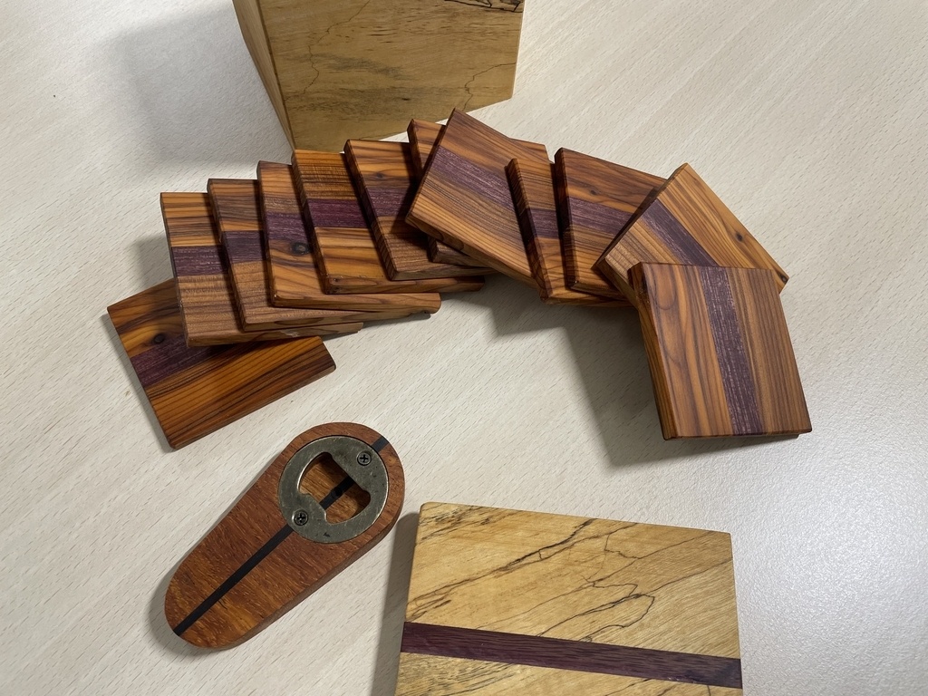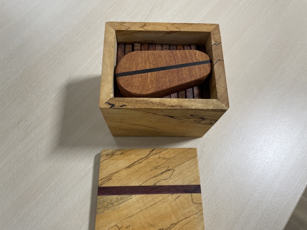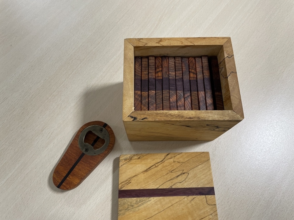 Petite commande d'une collègue pour Noël. Des dessous de verre avec une boite pour les ranger. Les dessous de verre sont en If et Amarante. La boite en figuier étrangleur échauffé avec un insert d'amarante sur le couvercle. Et comme j'avais un peu de place dans la boîte j'ai fait un décapsuleur en Mangkono avec insert de Ziricote. Un peu coup d'huile sur le tout et voilà :-)