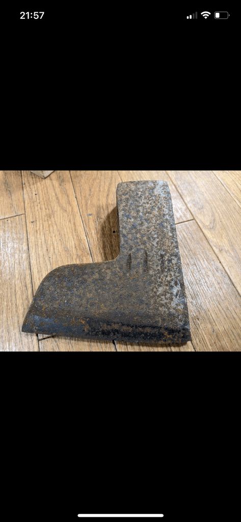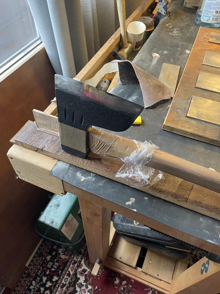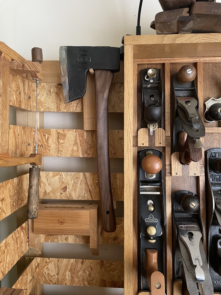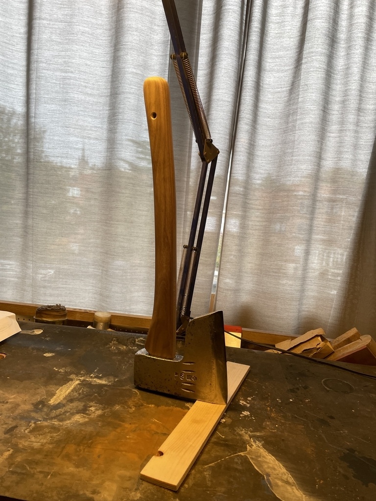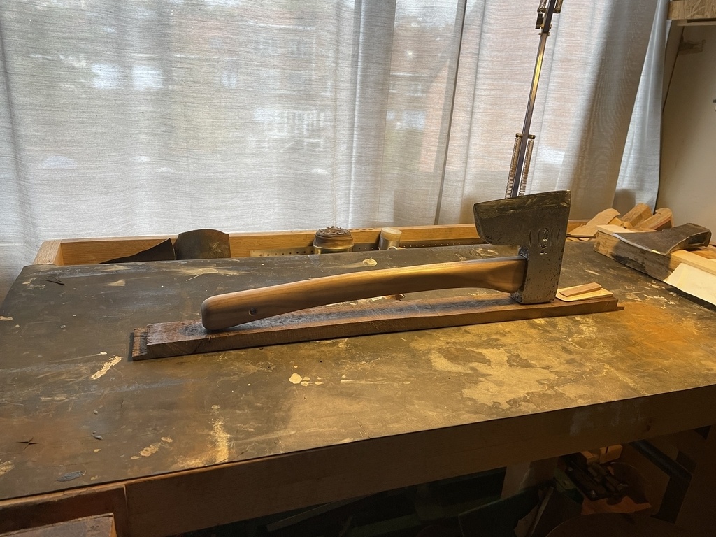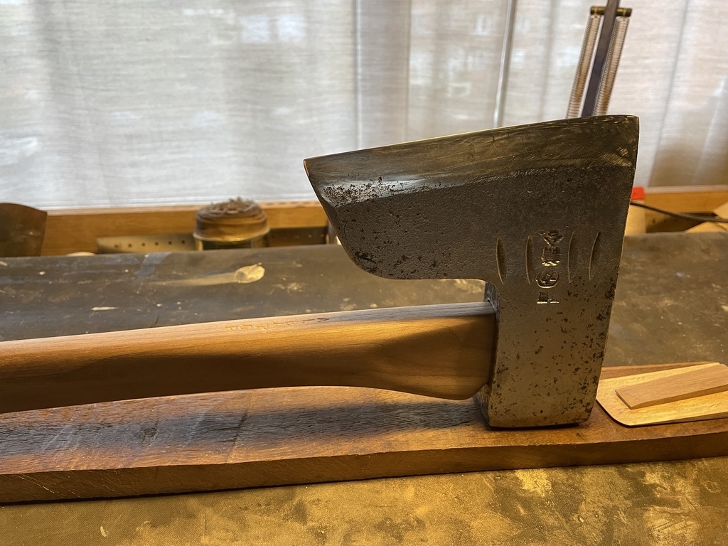 Un vielle tête de hache rouillée, un bout de noyer, de l’huile de coude! Ta dah!