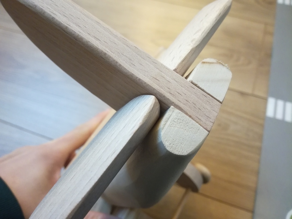 Le fuselage de l'avion est composé de 2 pièces identiques collées puis poncées ensembles, les ailes sont attachées ensembles et celle du bas est fixée au fuselage par des tourillons encollés. les ailerons latéraux sont fixés par un tourillon traversant à L'aileron verticale qui est lui même fixé par un assemblage à mi bois en bout.