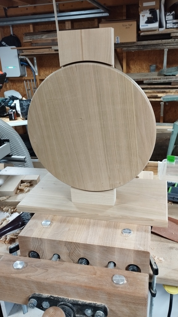La roue est découpée à la défonceuse (avec un compas de fortune... un morceau de plinthe quoi...).