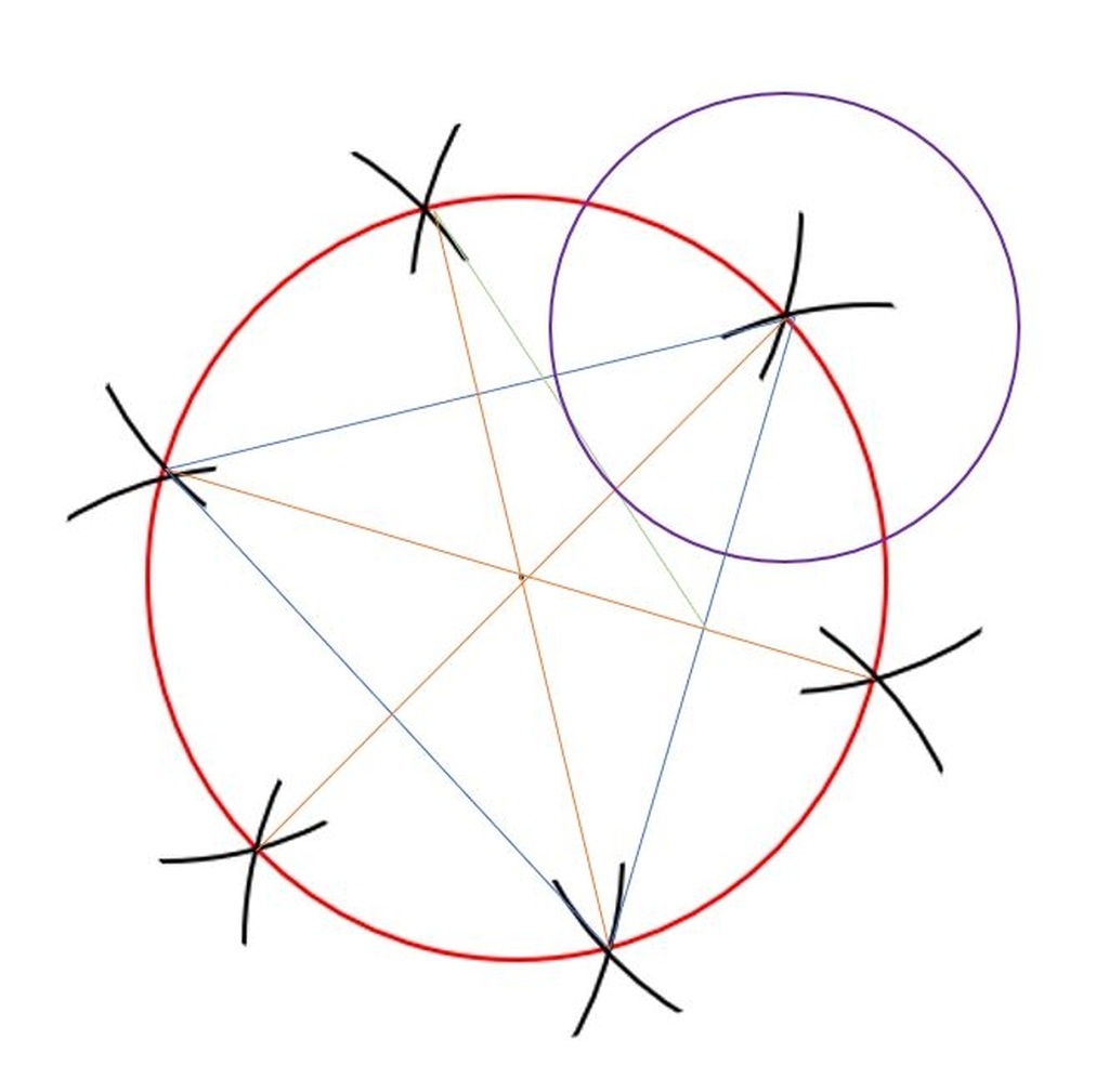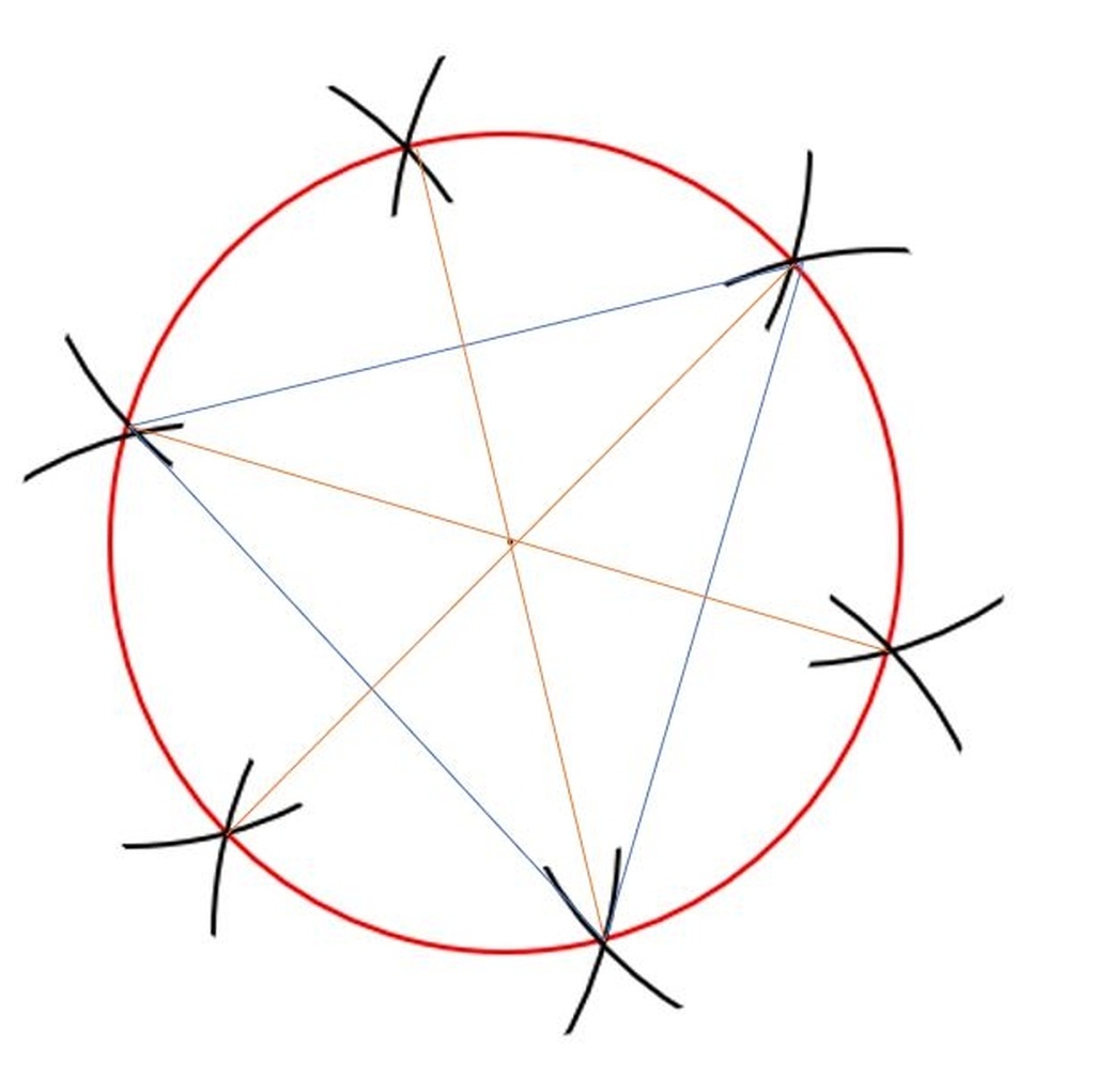 - Pour la division en 9 c'est un poil plus velu... : d'abord tracer un triangle isocèle entre 3 points (lignes bleues). Puis tracer les bissectrices de chaque sommet du triangle, c'est à dire simplement relier les points opposés du cercle (lignes oranges).