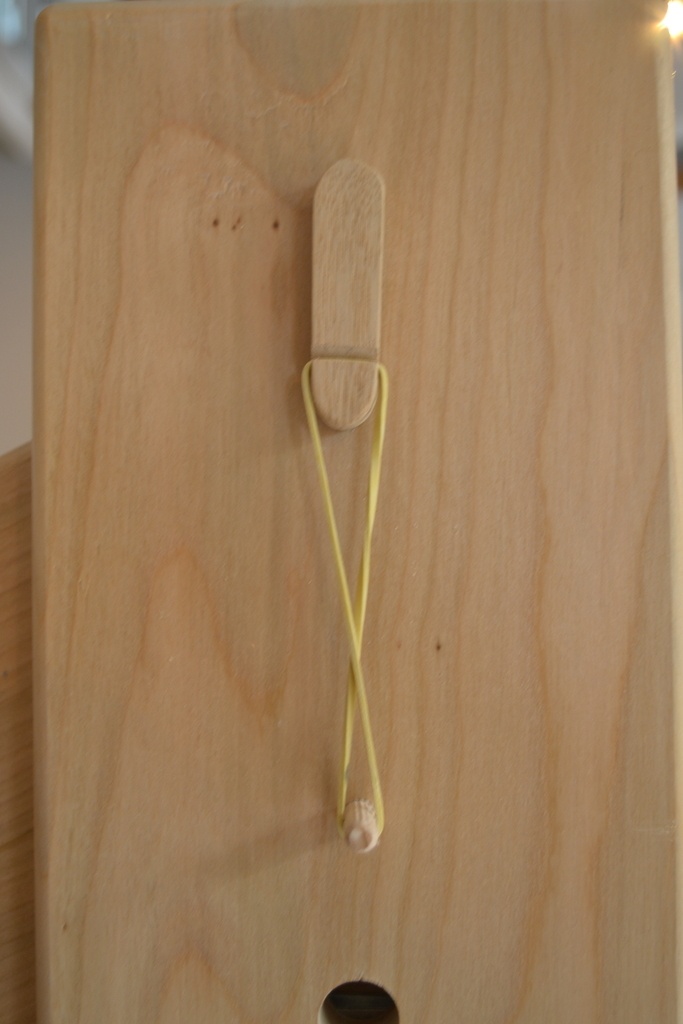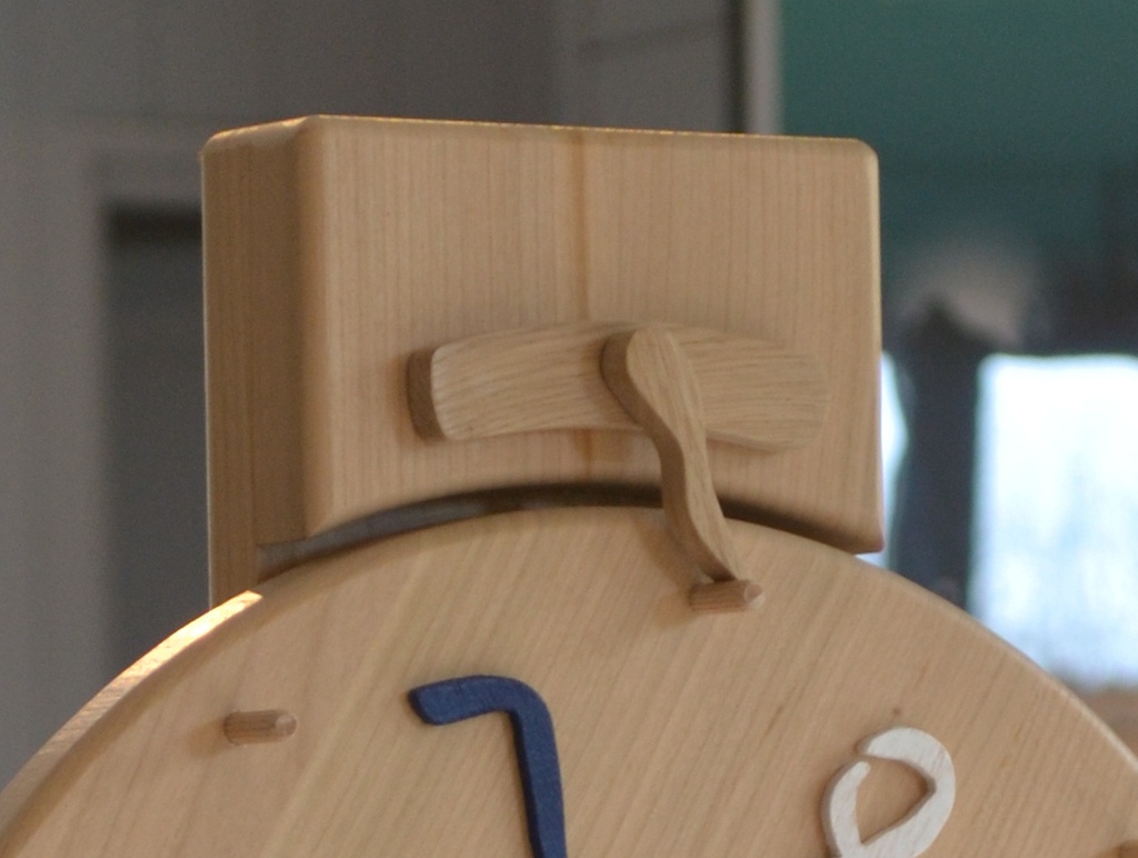 Le mécanisme est simple : une baguette ronde de 6mm traversant la tête du support, avec l'aiguille collée d'un côté, et un petit "balancier" collé de l'autre côté. J'ai également intercalé en face avant une pièce de bois pour l'esthétique, mais surtout pour avancer un peu l'aiguille (du fait du roulement à bille la roue est un peu avancée par rapport au support).