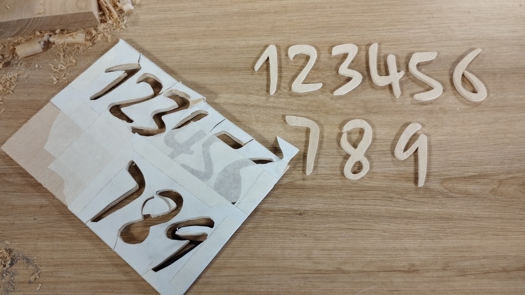 Les plus grandes pièces de bois sont tirées d'un plateau de frêne après dégauchissage, rabotage puis collage à plat-joint. J'ai uniquement appliqué un fondur. J'envisageais initialement d'ajouter une cire, mais j'ai eu peur de ne plus pouvoir coller les chiffres.