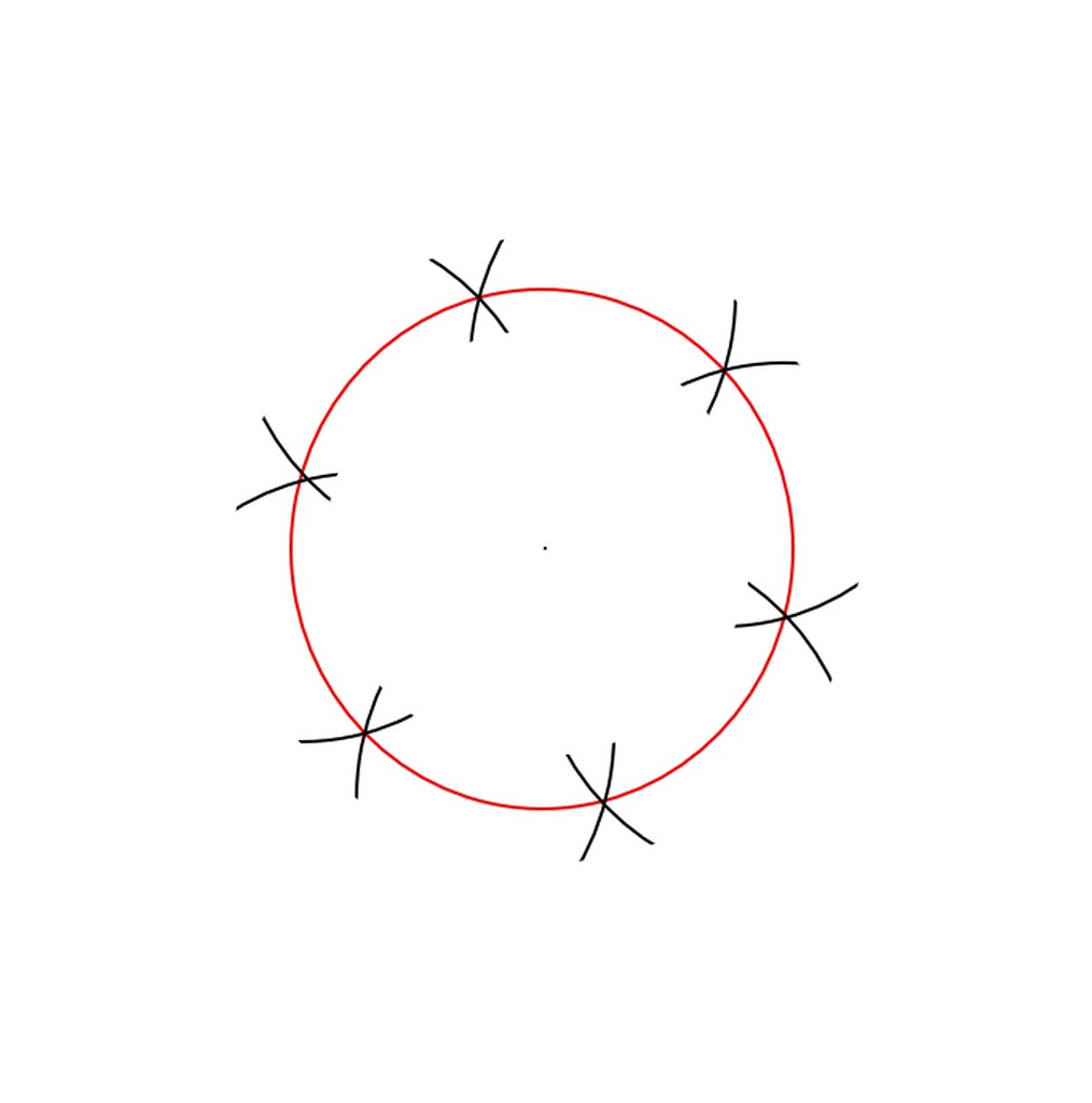 - Pour la division en 6 c'est facile, on garde le compas réglé au rayon du grand cercle, on pointe le compas sur le bord du cercle, puis on reporte le rayon sur le cercle jusqu'à avoir fait le tour.
