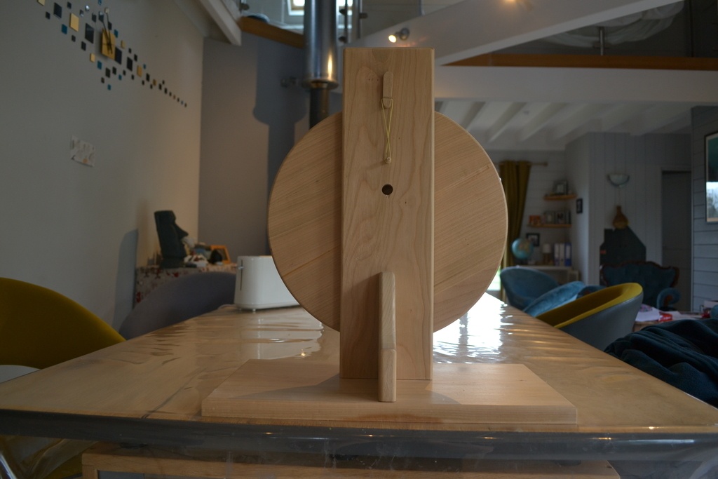 La roue est évidée d'environ 5mm à la défonceuse sur sa face postérieure pour éviter une surépaisseur trop importante liée au mécanisme.