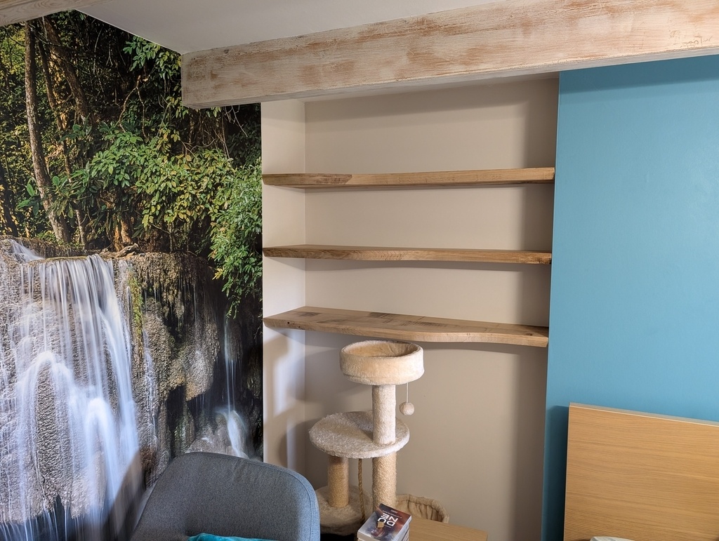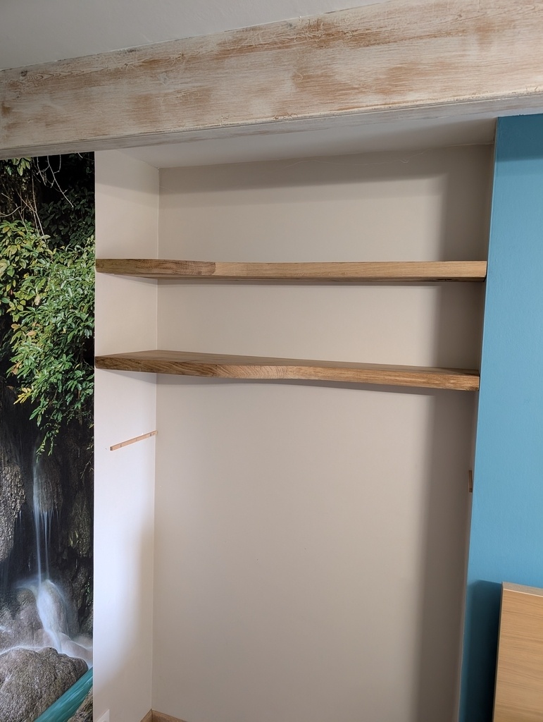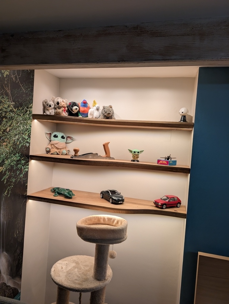 Pour les adapter à la corniche de 1.14 m mais qui ne laissait que 21 cm de profondeur à droite, ce qui aurait été trop peu pour être pratique, j'ai fait un espèce d'épaulement qui amène la profondeur à 34 cm, soit au début de la tapisserie sur la gauche. J'ai fait une défonce sur le dessous de chaque étagère pour y intégrer un ruban de LED. L'alimentation 24 V est cachée dans le grenier au dessus et les câbles passent dans des gaines derrière la cloison.