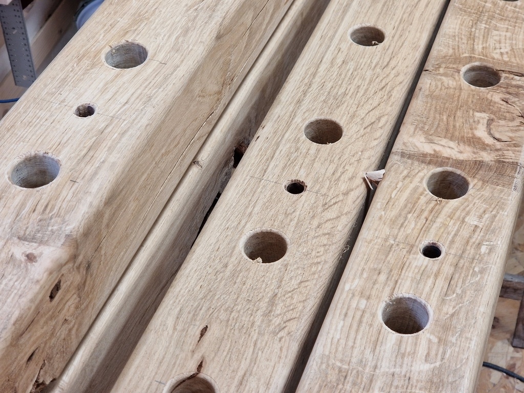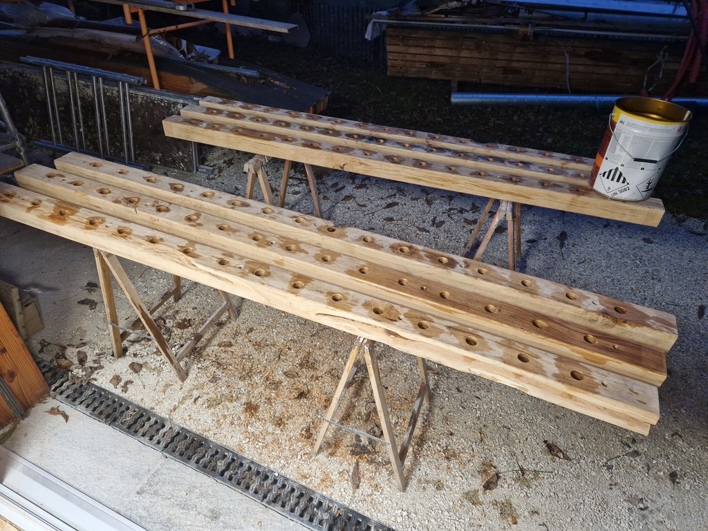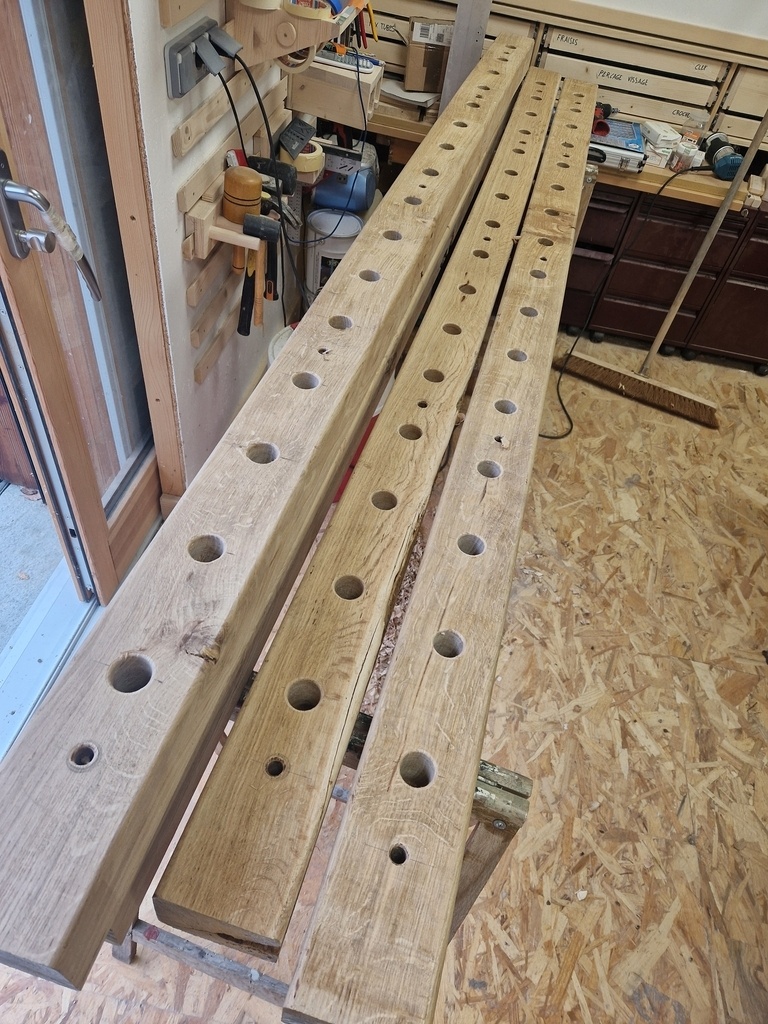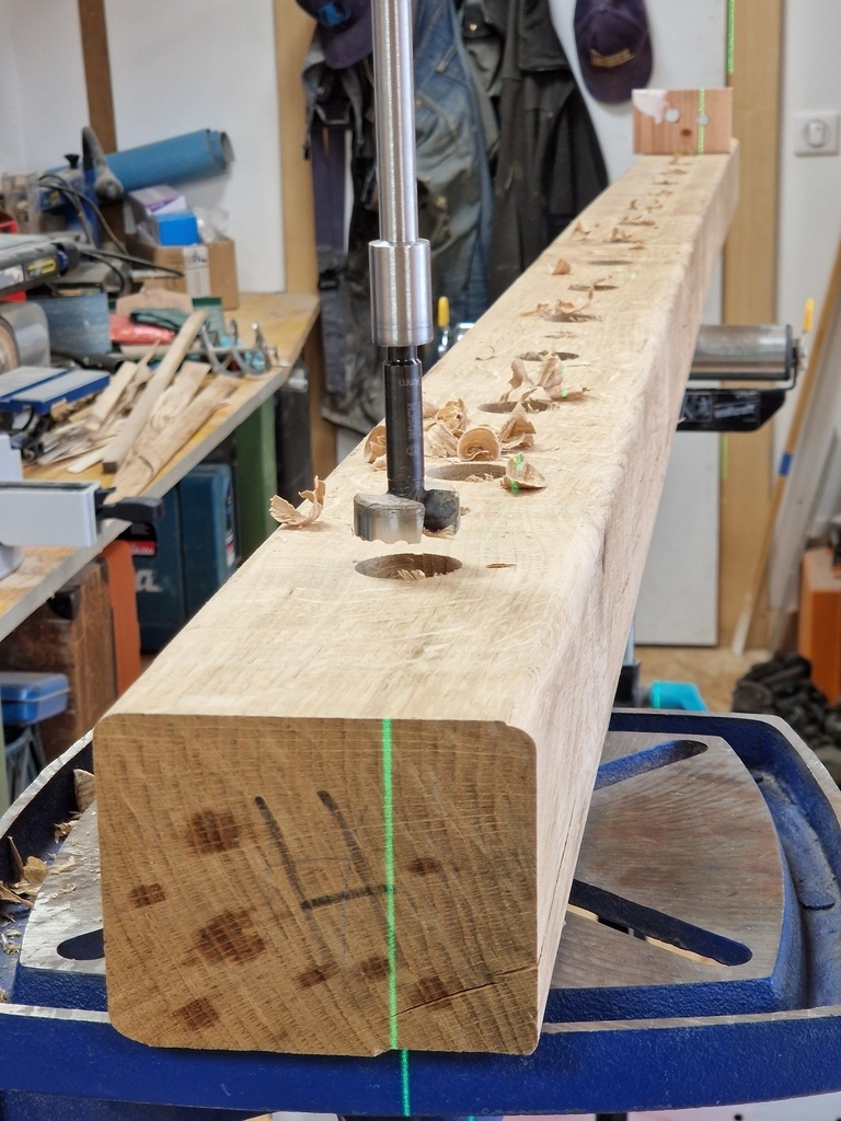 Un peu de manipulation en mettant les montants, traçage au laser de la position des tubes et retrait pour percements. Mais ça permet d'être bien sur que tout est bien aligné. Aussi un peu de volume purgé dans les traverses.