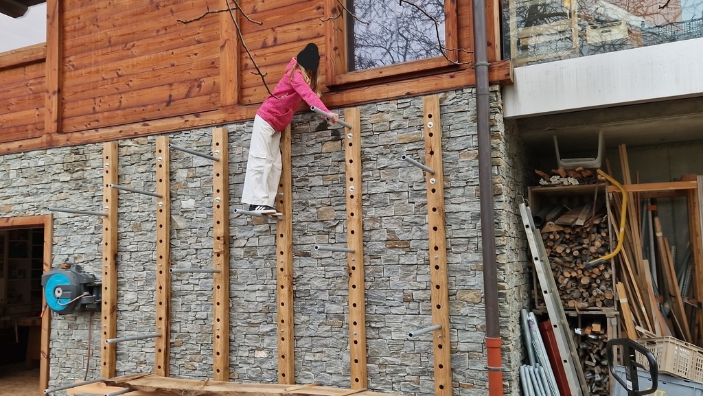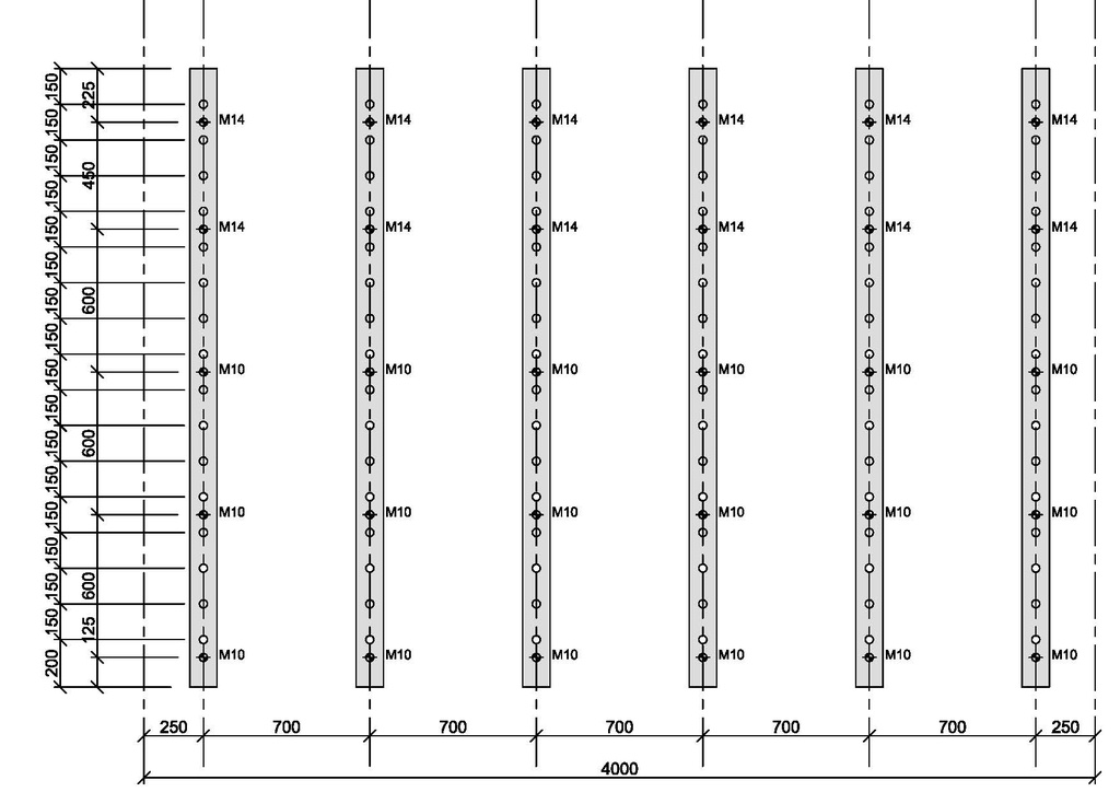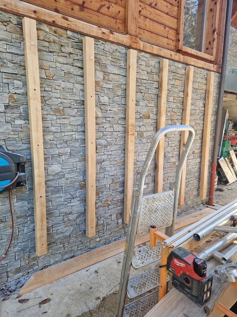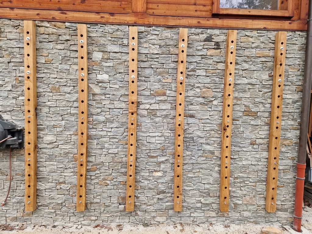 - Mise en place des 30 tiges filetées avec scellement chimique dans le mur béton plein derrière la pierre (6 montants * 5 scellements). Le mélange de diamètres de tiges vient de ce que j’avais chez moi à ce moment. Les plus grosses en haut car ça tire plus...