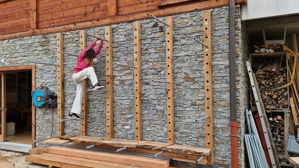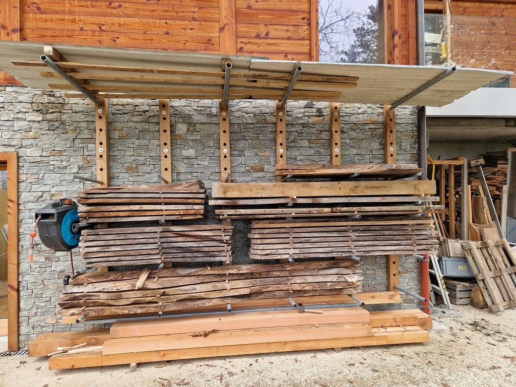 Alors ça faisait un moment que des piles de plateaux étaient stockées à gauche à droite sous des tôles et elles méritaient bien mieux... J'ai un peu hésité à cacher un mur recouvert de parement en pierres fait il y a quelques années qui m'a particulièrement fait transpirer mais c'était l'endroit le plus adapté.