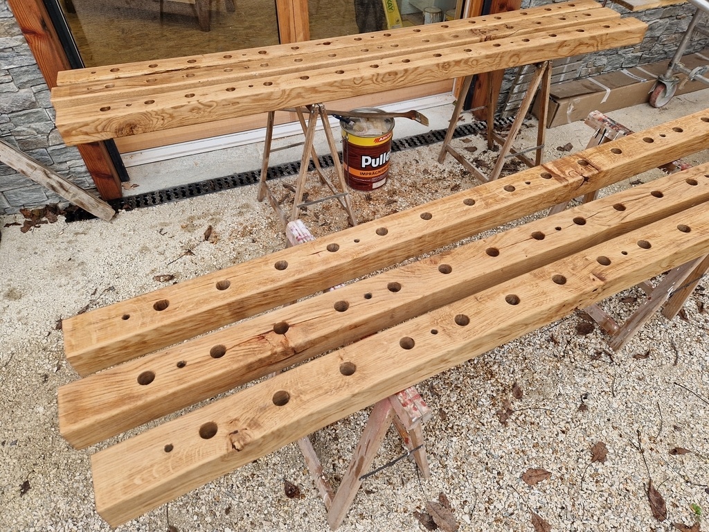 - Percements de traverses en conséquence et mise en place contre le mur