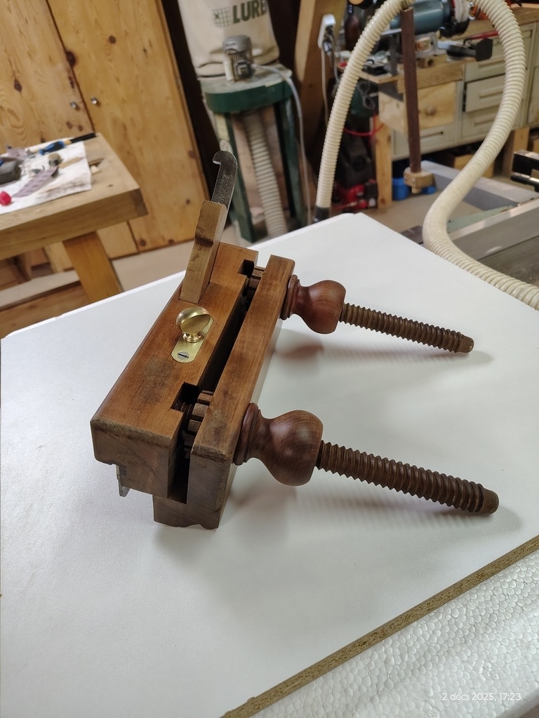 La restauration à consisté essentiellement à du décapage. Le bois était couvert de tâches de peinture.J'ai enlevé le plus gros au grattoir et terminé à la toile de ponçage 320. Les parties métalliques étaient très oxydées pour le laiton et rouillées pour le métal. J'ai tout démonté et passé à la brosse métallique sur touret.Le fer a été réaffuté. Après avoir tout remonté, j'ai appliqué une couche de cire naturelle transparente. Le résultat est très convaincant