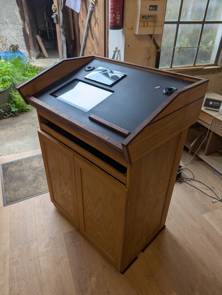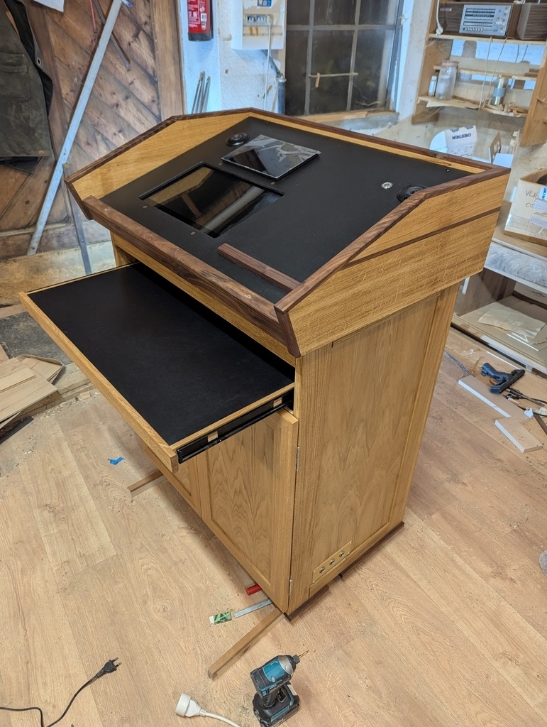 Il est réalisé en chêne massif et panneaux de chêne. le plateau qui accueil les écrans et micros est en panneau fibracolour noir. J'ai aussi ajouté des insertions de noyer noir.
