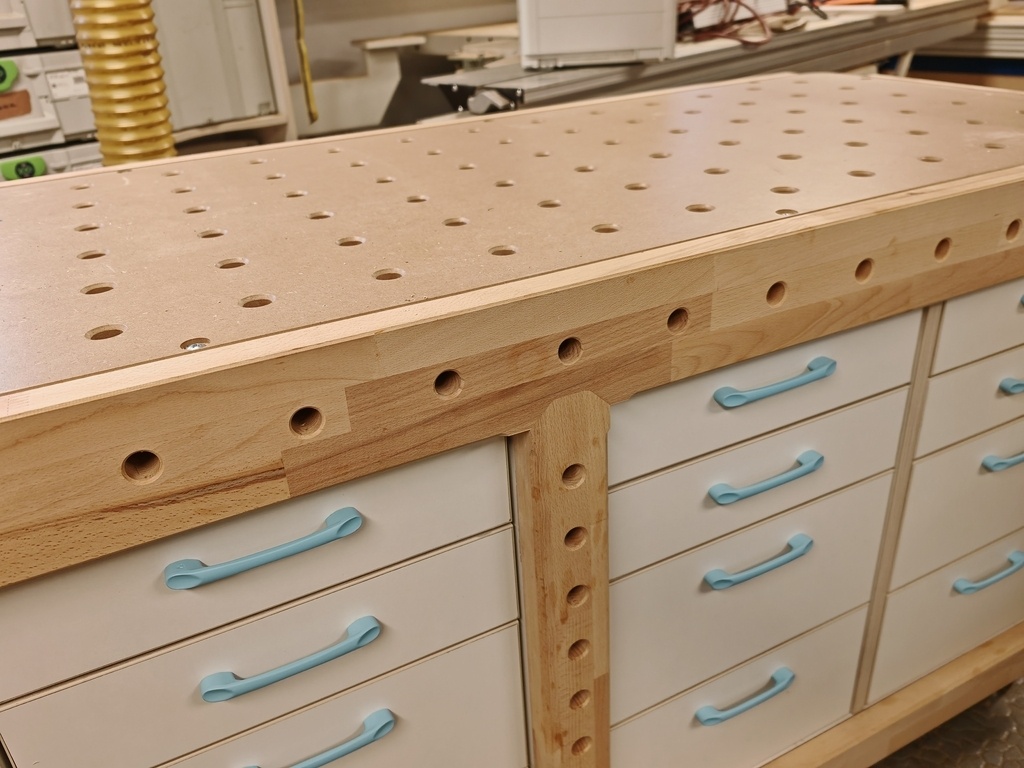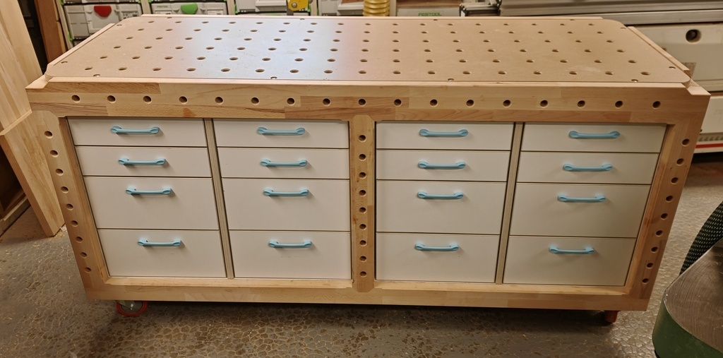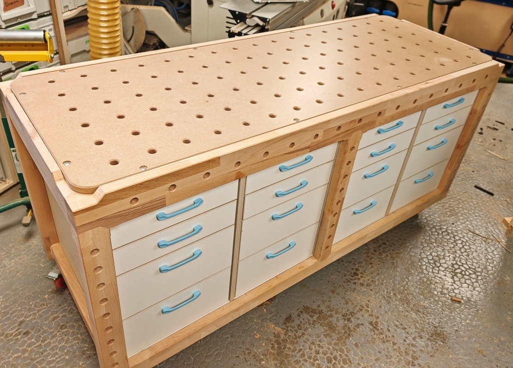 Atelier mobile 1800x700 h900, 16 tiroirs avec glissières à billes de 550mm, caisses en mélaminé, structure en carrelet de hêtre 60x70mm. Perçage en 19mm sur la structure, 20mm sur le MDF avec entraxe de 96mm.