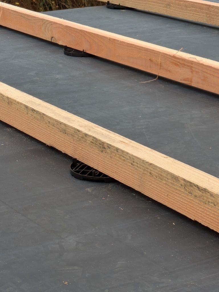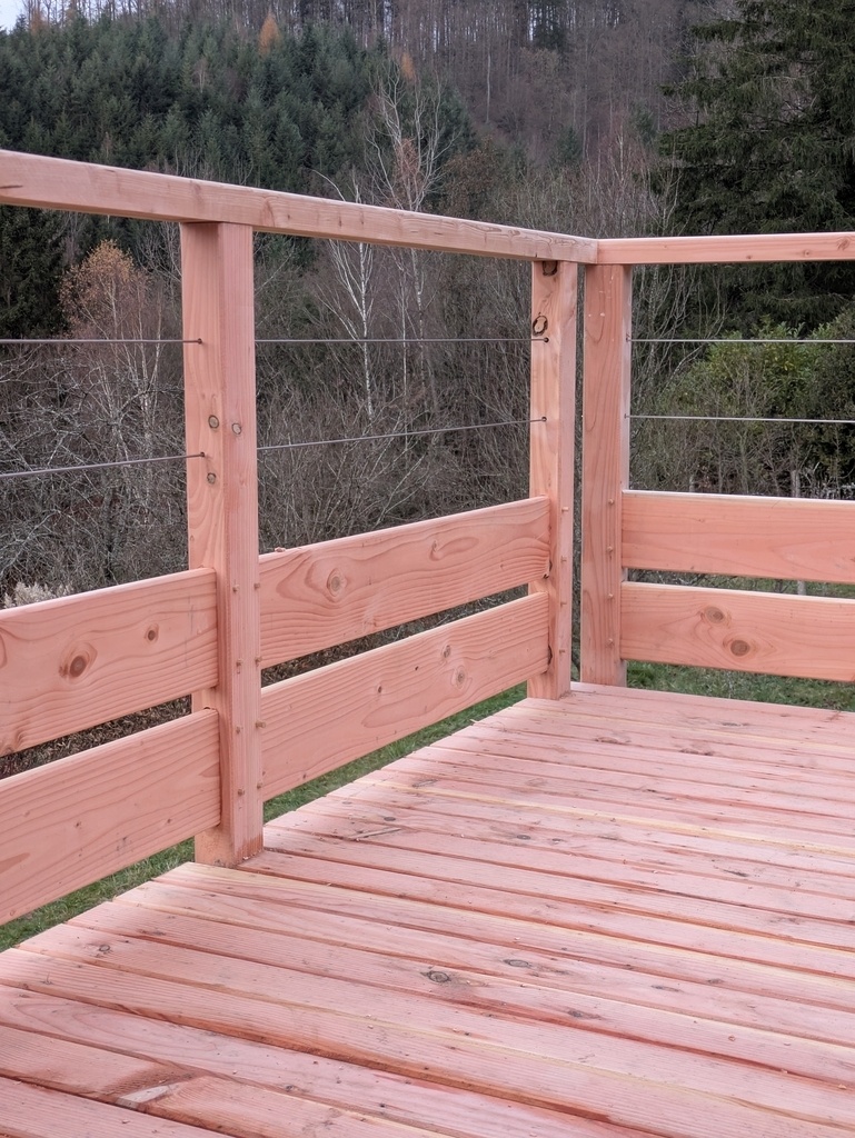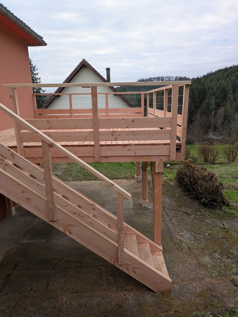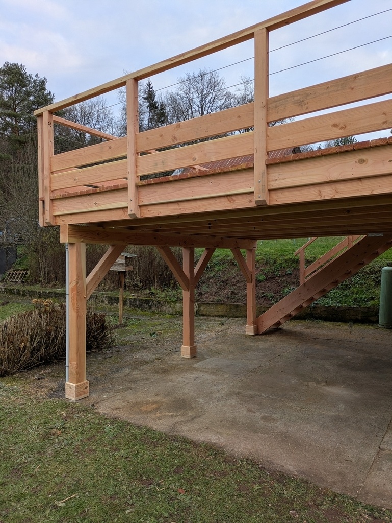 Installation d'une terrasse sur pilotis en Douglas de 5 x 4,50m. Les clients voulaient un espace protégé en dessous, la structure est donc étanche. Les solives sont recouvertes par de l'OSB de 22 mm, puis un film EPDM de 2mm et ensuite les lambourdes sont posées sur des cales fixes de 10 mm. Avec en prime une belle vue sur la forêt pendant tout le chantier.