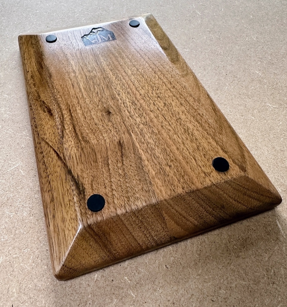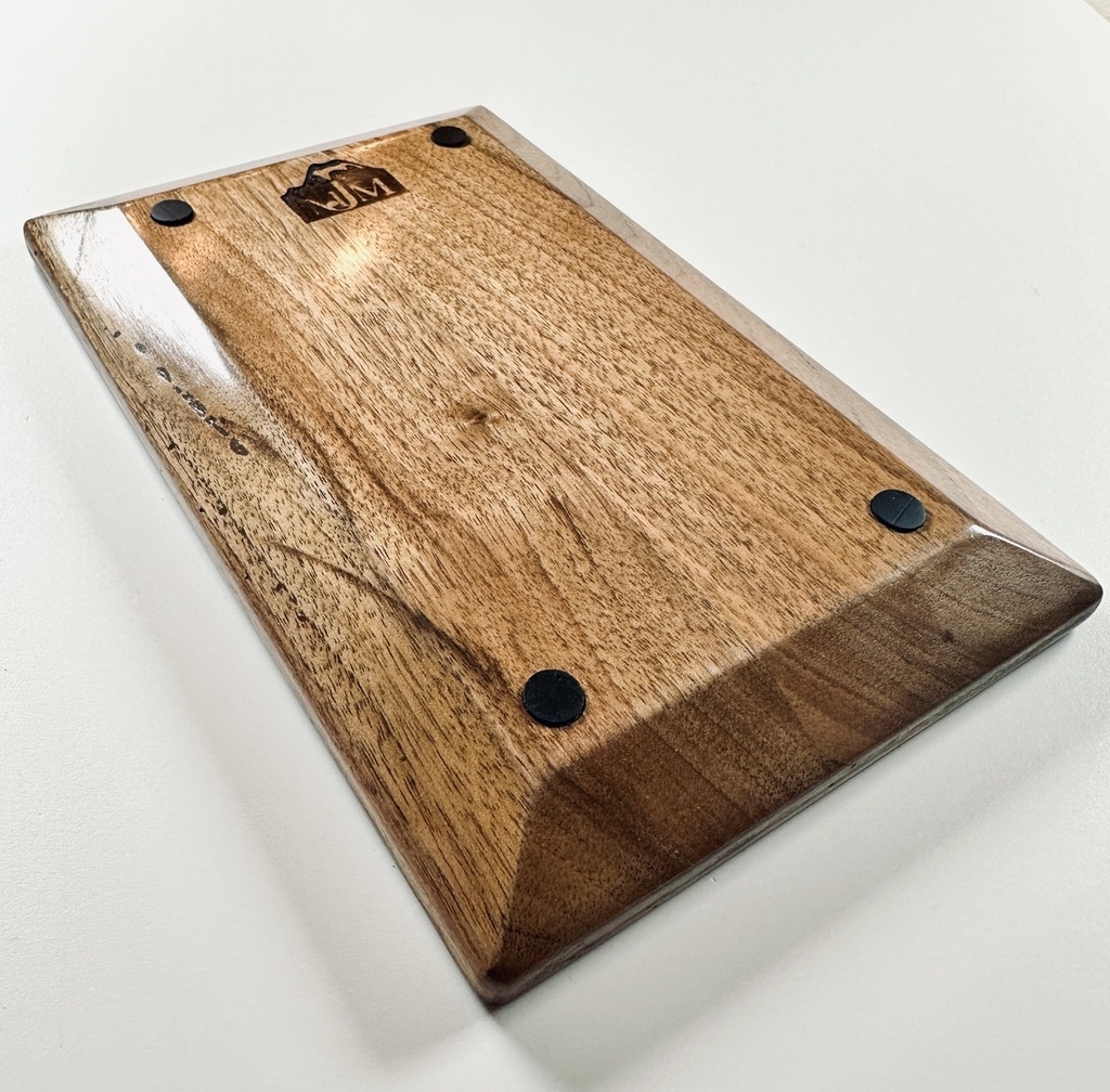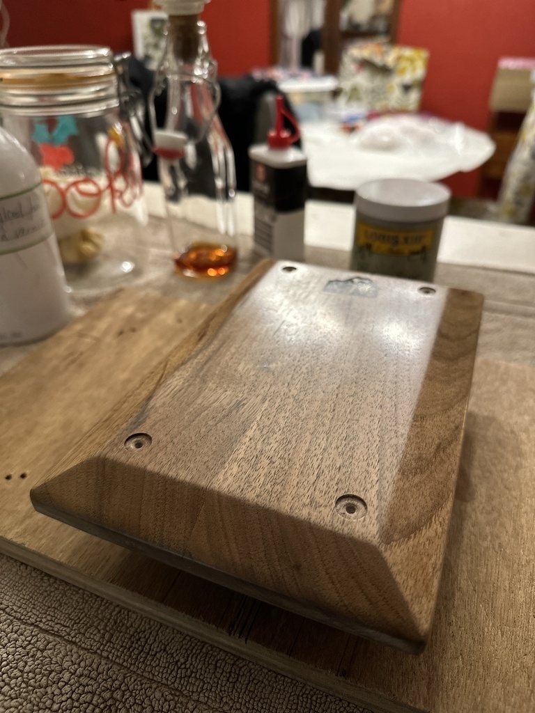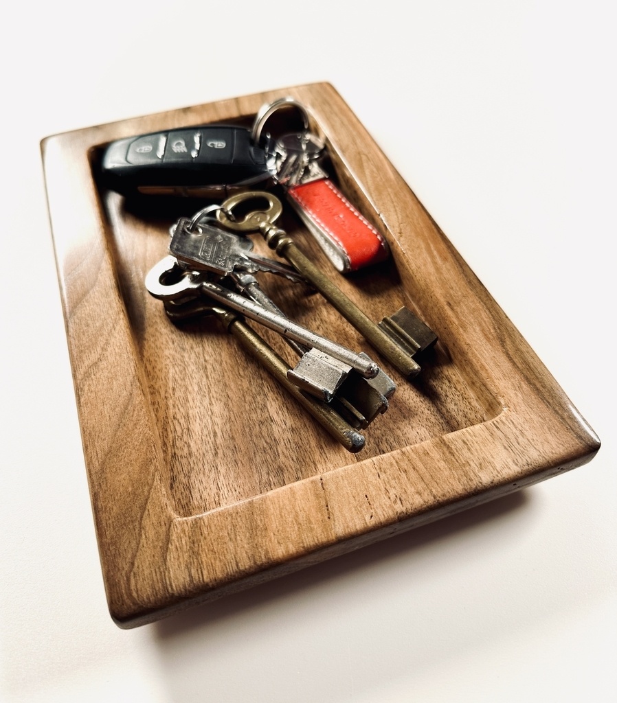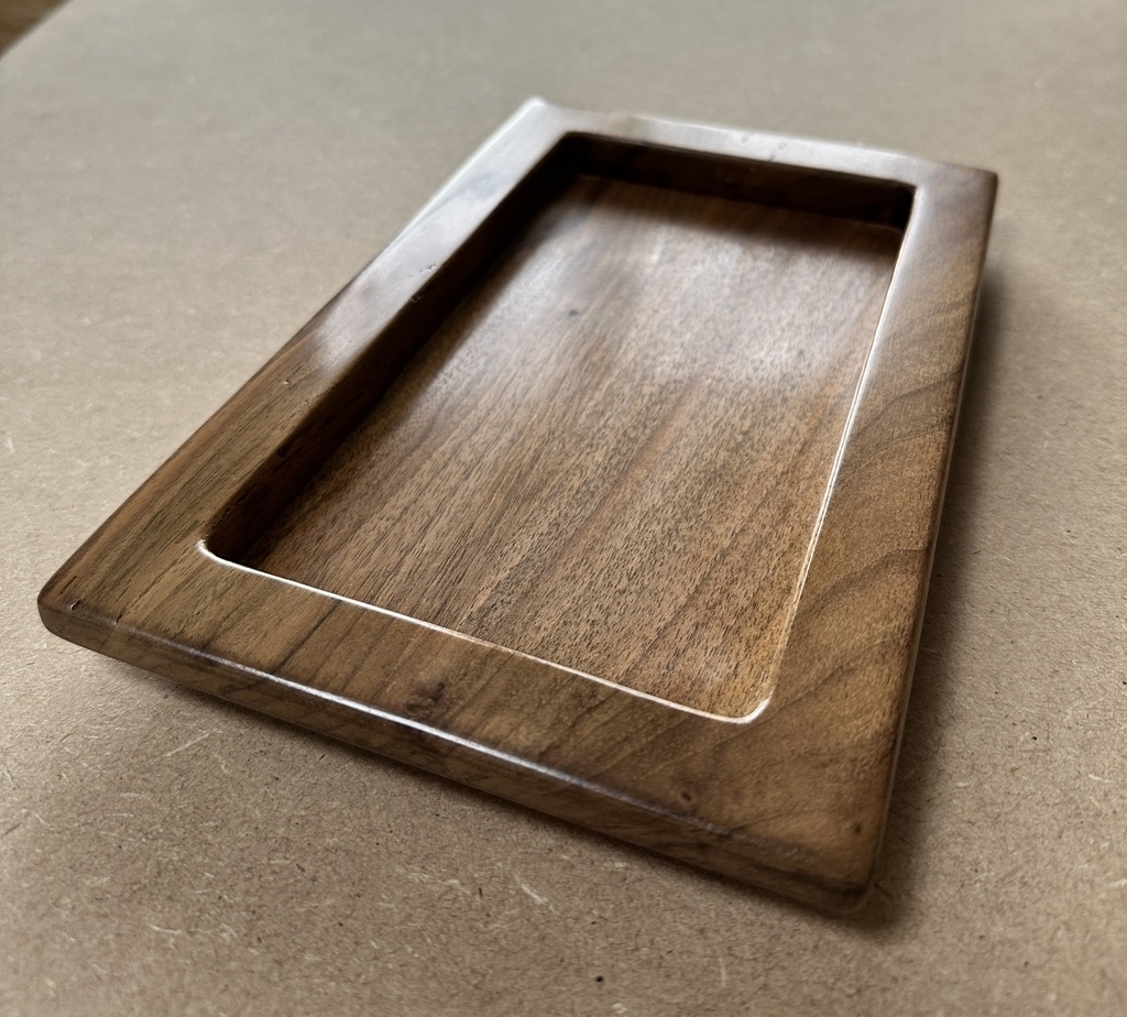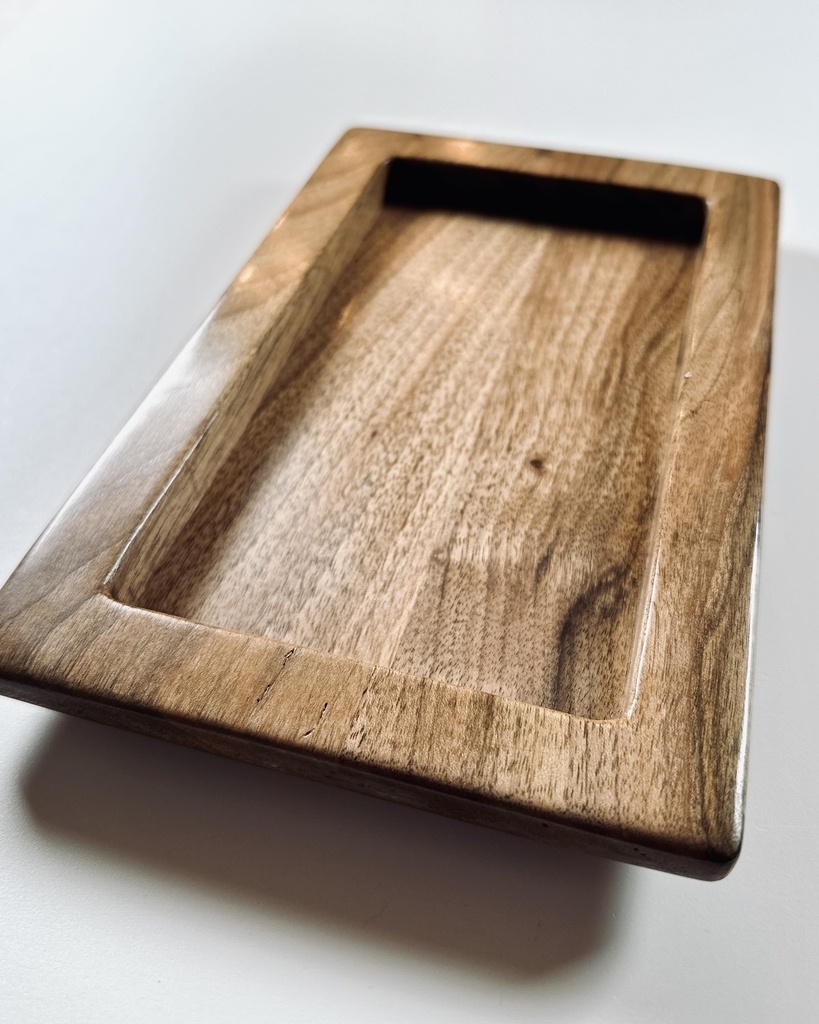 Réalisation d’un vide poche en noyer.Finition gomme laque.8 tamponnées sur chacune des faces.