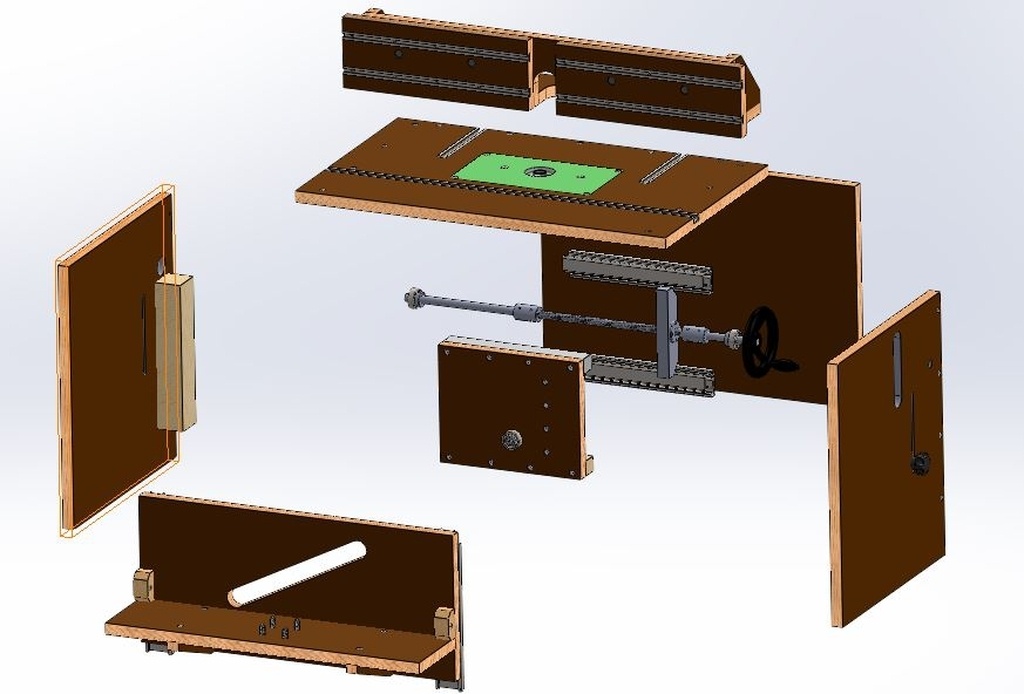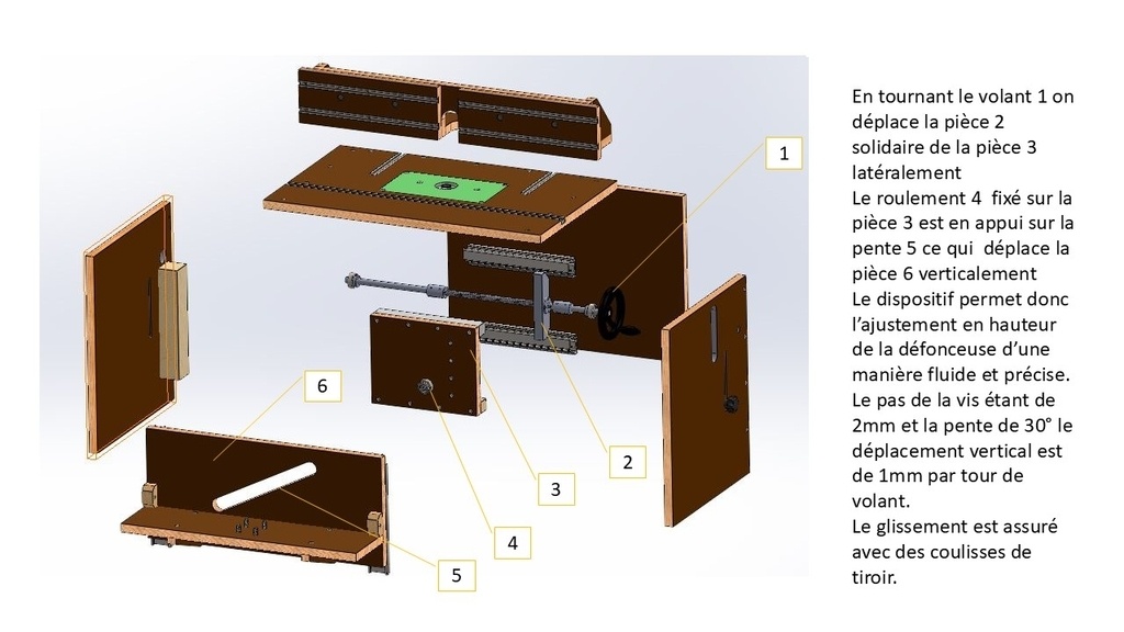 Les jeux sont très minimes, la vis et écrou sont quasiment sans jeu et les coulisses de tiroir le jeu est très faible et les ajustements d'usinage sont précis ,notamment la pente sur laquelle le roulement se déplace, mais l'important est le système de réglage quand on tourne la manivelle dans le sens de montée je jeu s'annule, il ne reste qu'ensuite à bloquer le système aves les deux vis sur les cotés, qui par la suite seront remplacées par des boutons. Il y a aussi la possibilité de bloquer avec le levier direct sur la défonceuse. Voila, j'espère avoir été assez clair.