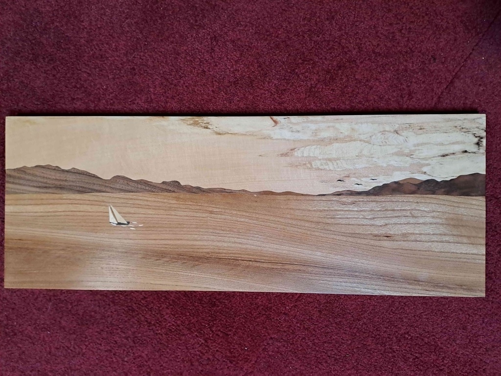 La mer est en orme, le ciel en marronnier, l'arrière plan en noyer et merisier