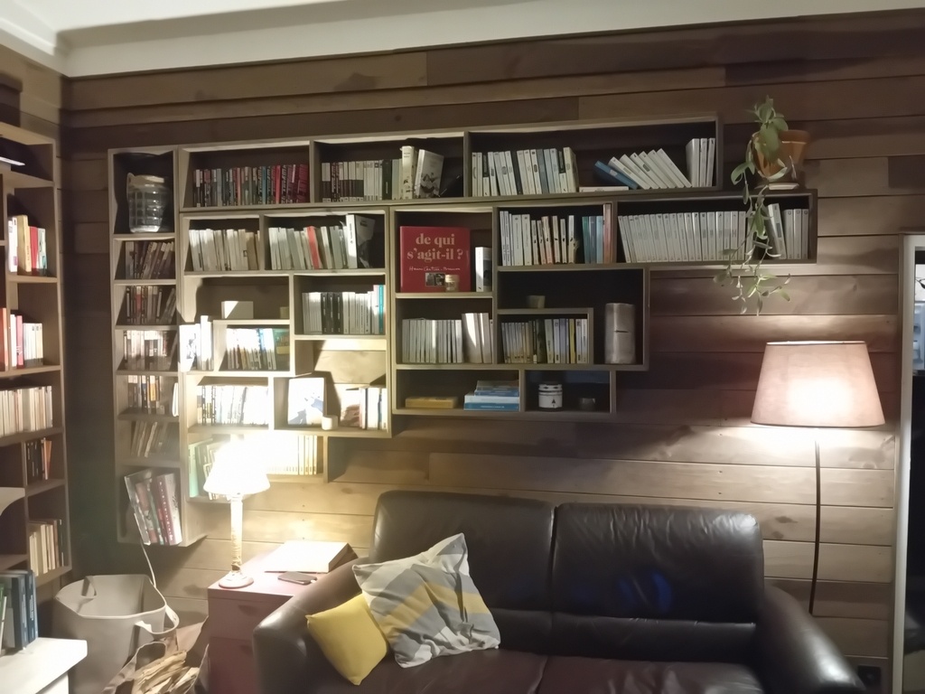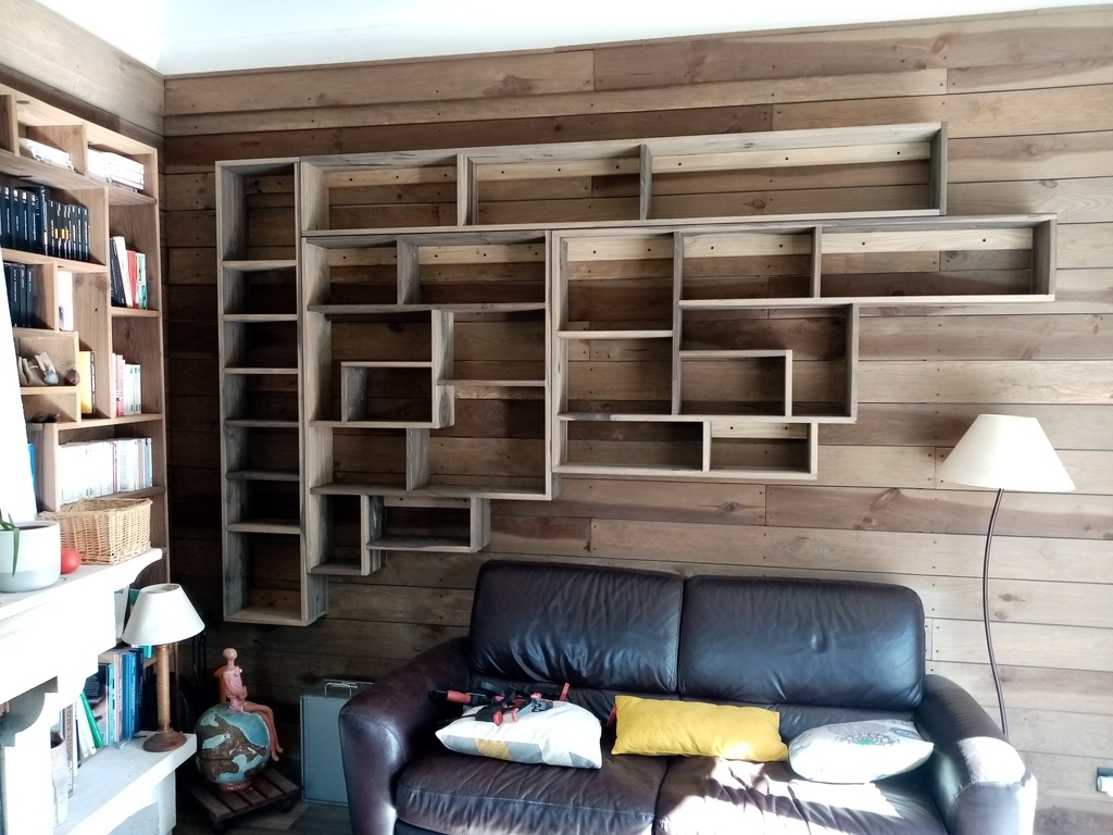 Réalisation d'une bibliothèque en Douglas et avec une ébonisation pour griser le bois. Assemblage lamello.