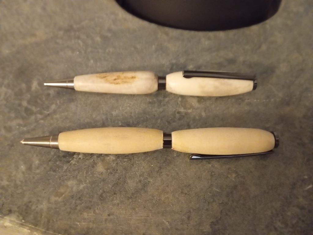 Celui de devant est en bois d'actinidia et le 2ème en bois de cerf. ils ont la même taille; la différence sur la photo est due à la perspective.