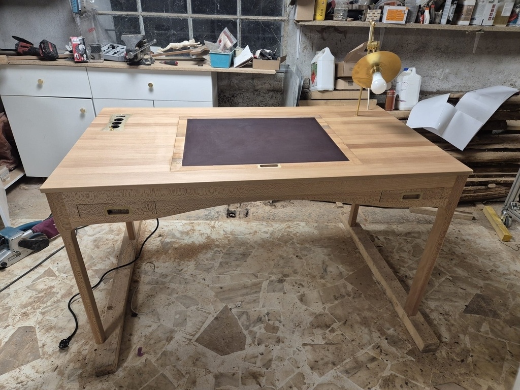 Plusieurs spécificités : l’intégration d’une multiprise et d’une lampe directement dans le meuble, ainsi que le collage de cuir dans les tiroirs, sur le plan de travail et à l’intérieur de la trappe.