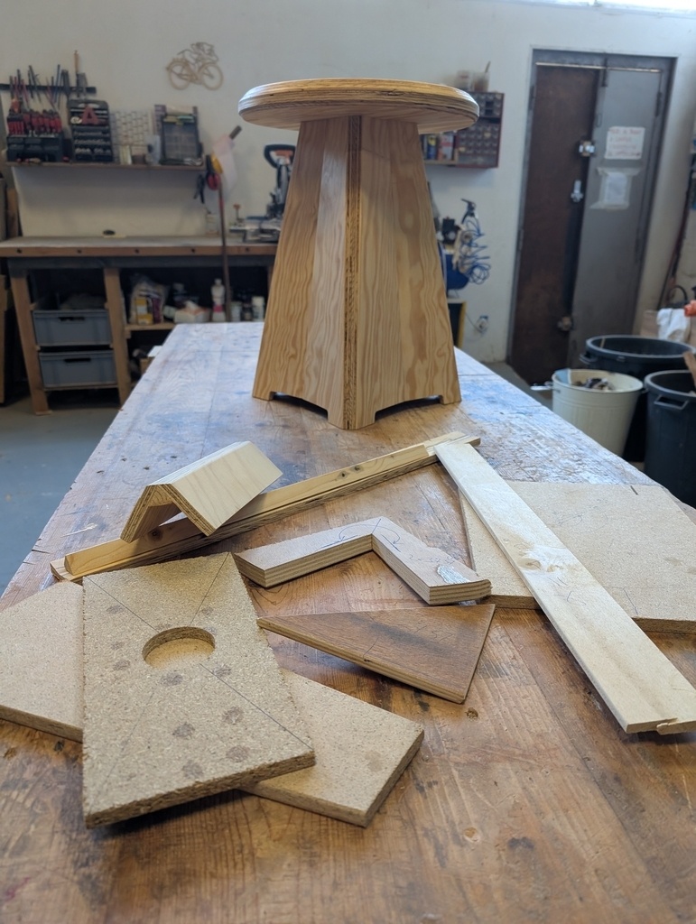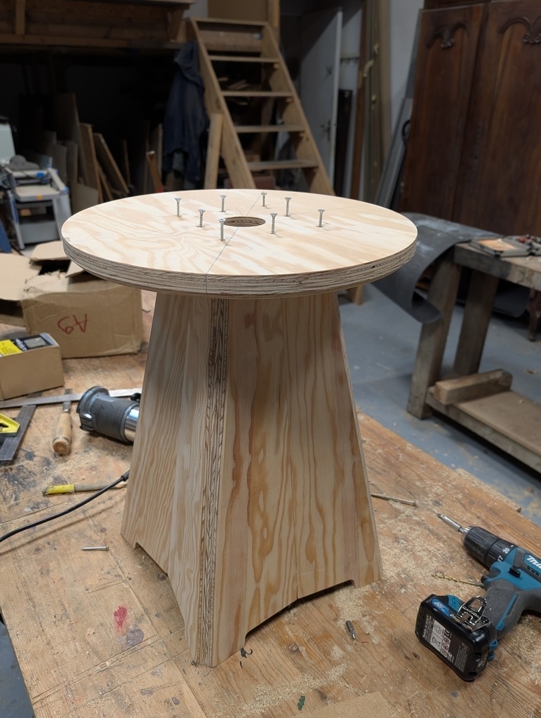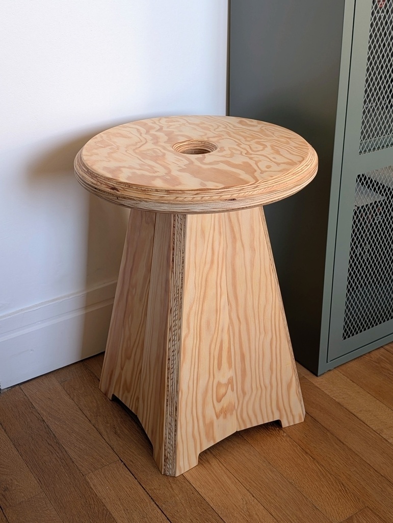 Tabouret en pyramide tronquée, avec faces rentrantes.Inspiré du tabouret metalique de Jean Prouvé.