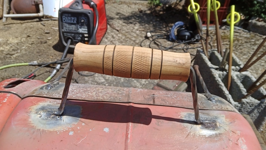 pour la poignée 2 perçage et un clou de chaque coter que j'ai soudé après pas de prise de tête ^^ Pour les précautions il est préférable de la remplir d'eau avant pour être sur qu'il n'y est plus de gaz a l’intérieur après tu est bon pour faire des étincelle dans tout les sens ^^