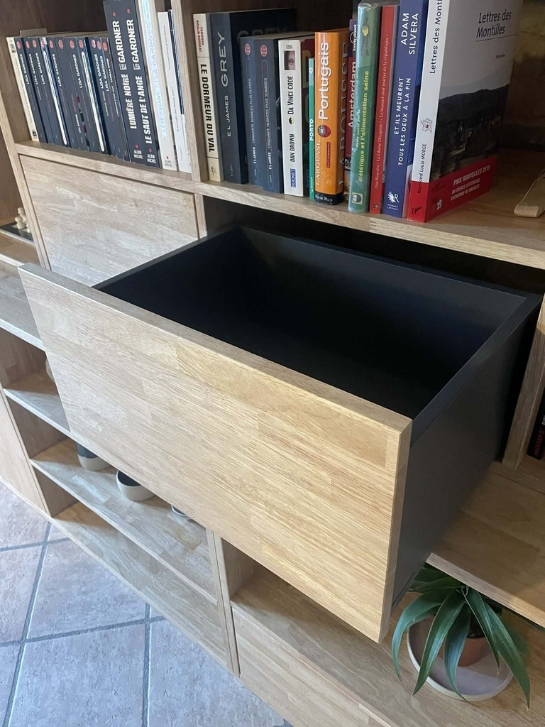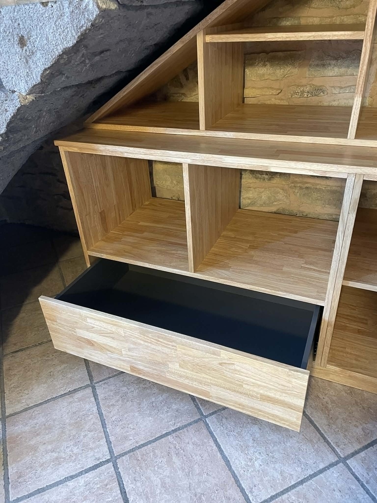 Fabrication d'un placard en hévéa sous escalier. Les clients n'ont pas souhaité de fond pour garder le visuel des pierres derrière. Avec tiroirs et portes en ouverture Tip On.