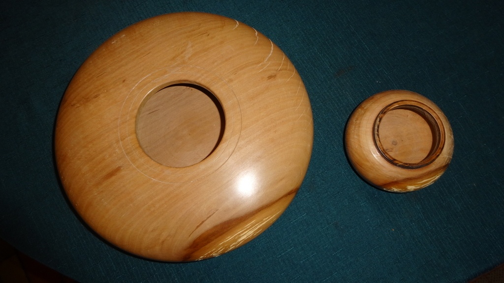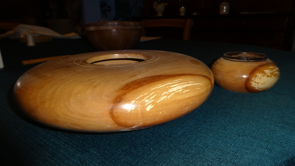 Je me suis empressé de la mettre sur mon tour à bois pour en faire deux vases plats.