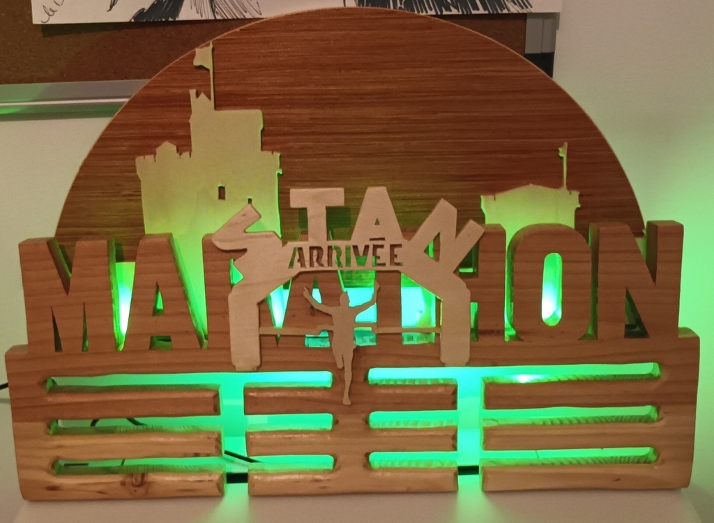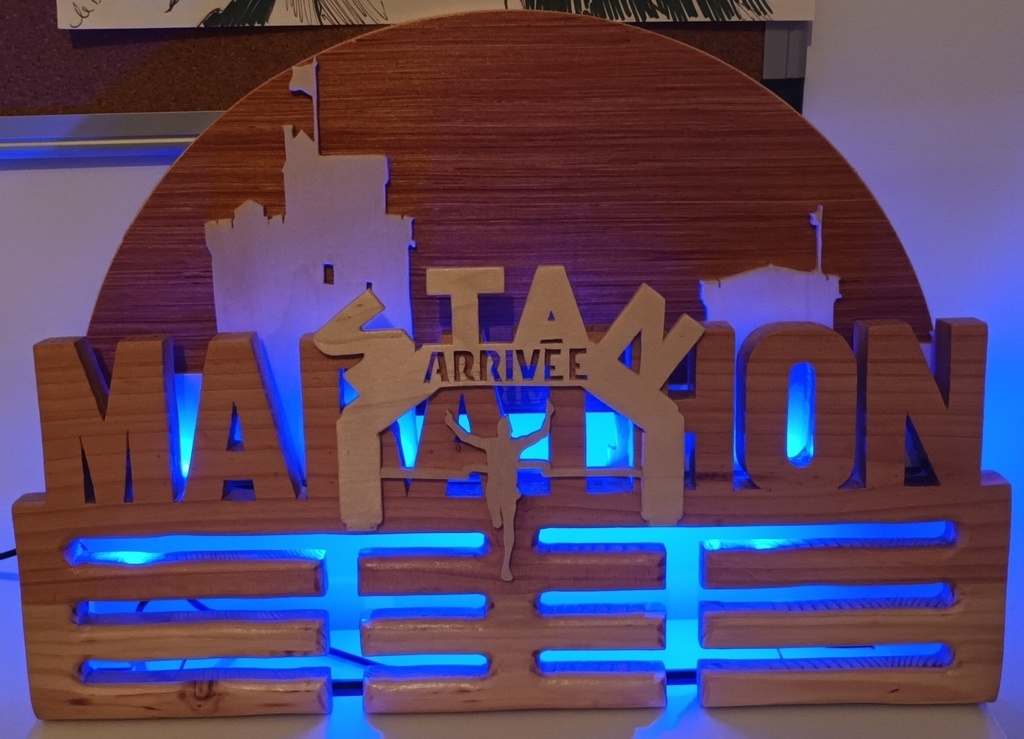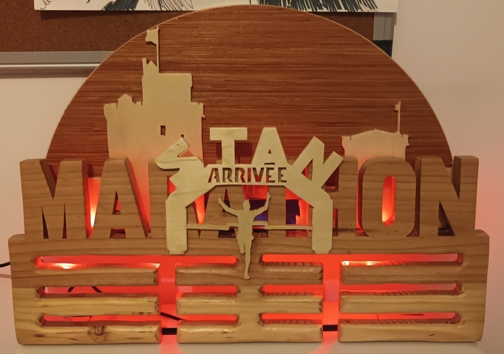 Réalisation d'un support médailles pour un ami marathonien, avec un éclairage leds et sa télécommande.