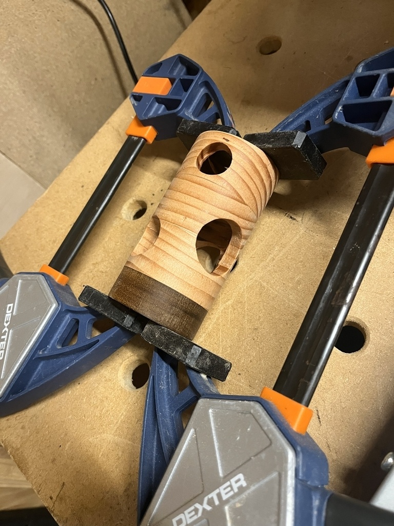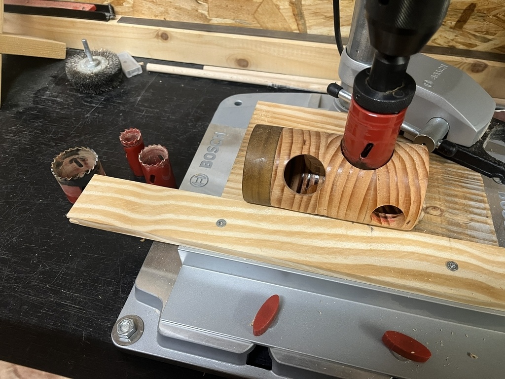 Pot à crayons en bois douglasIntérieur coupé à la scie cloche puis coller.Une fois l'ensemble collé, perçage à la scie cloche tout autour de différents diamètres.