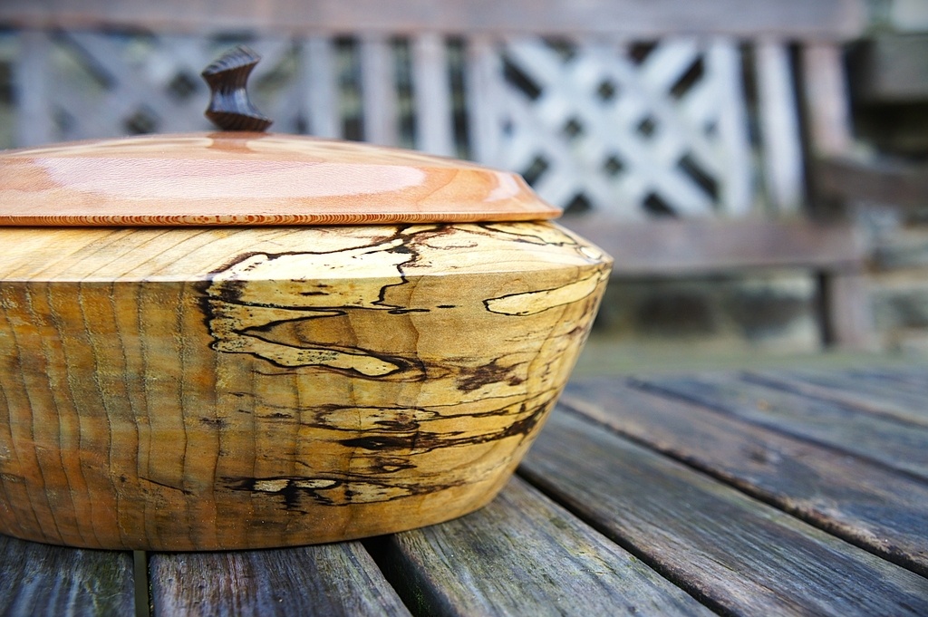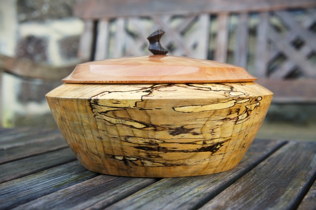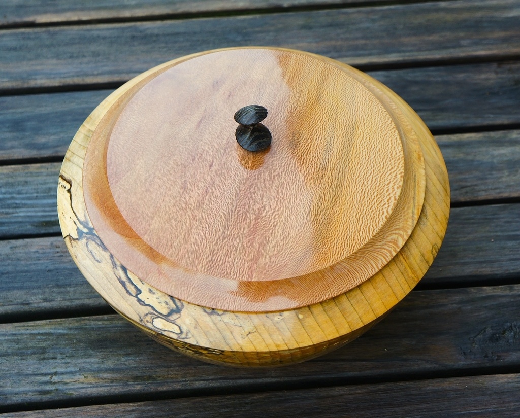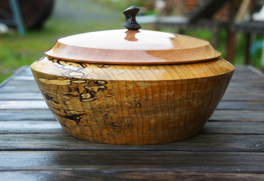 Bonjour, une boite réalisée au tour, en tilleul, platane et frêne. 22 cm de diamètre. Elle est finie à la cire de carnauba.