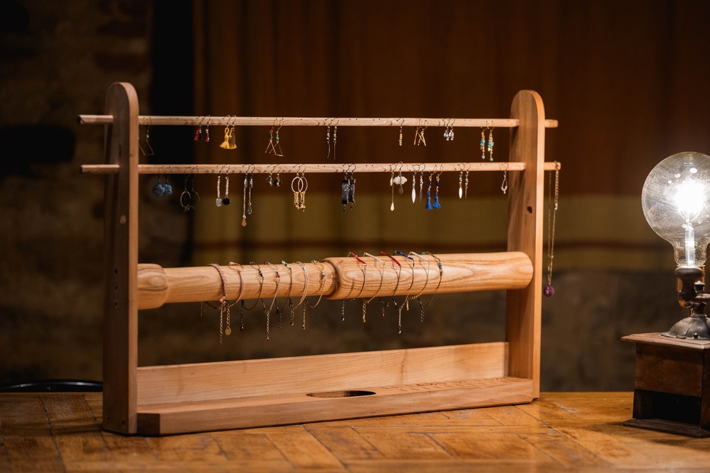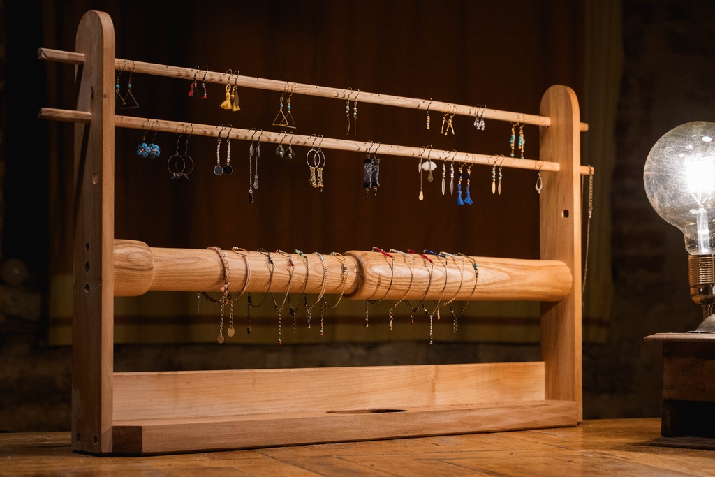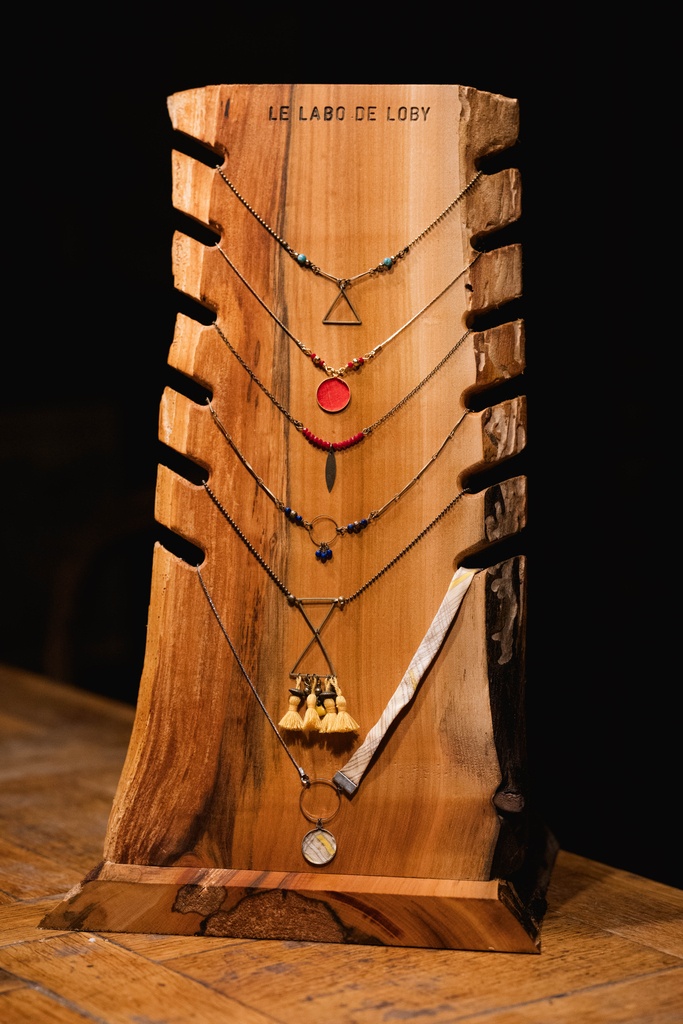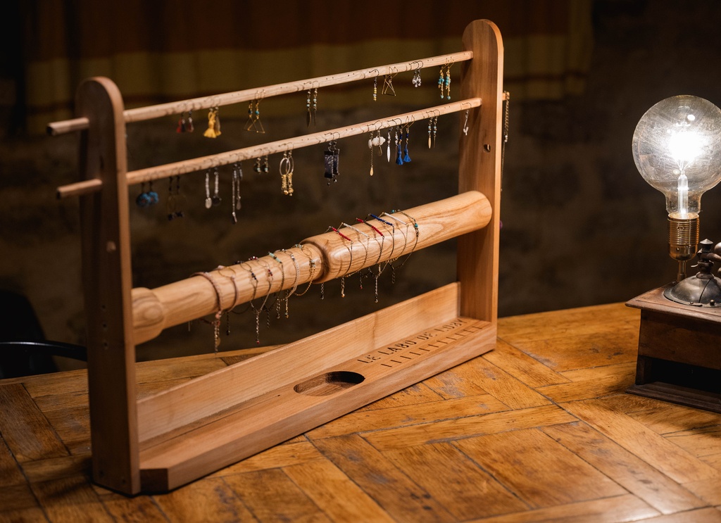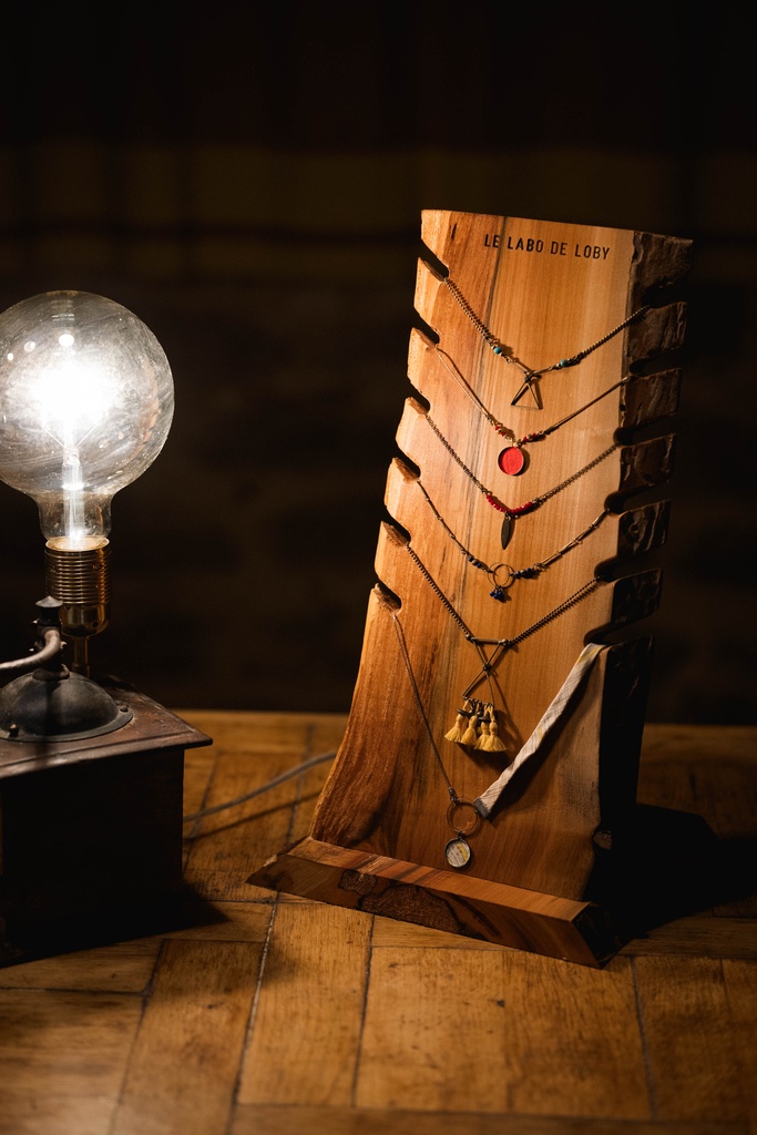 Voici deux objets très simples pour présenter des bijoux sur un stand de marché. Réalisé en chutes de diverses essences, érable, frêne, et sûrement un fruitier au cœur un peu mou.