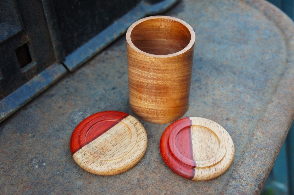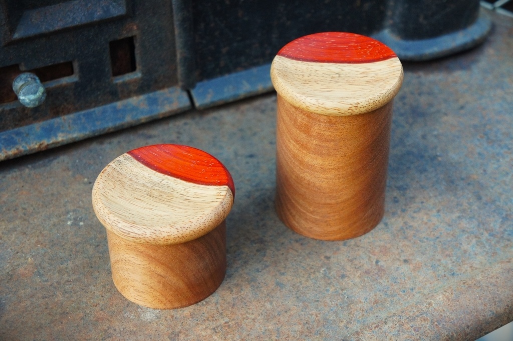 Boites en forme de tubes, en niangon et padouk. La finition est cirée, les tenons de boites sont repris sur un emprunt en bois.