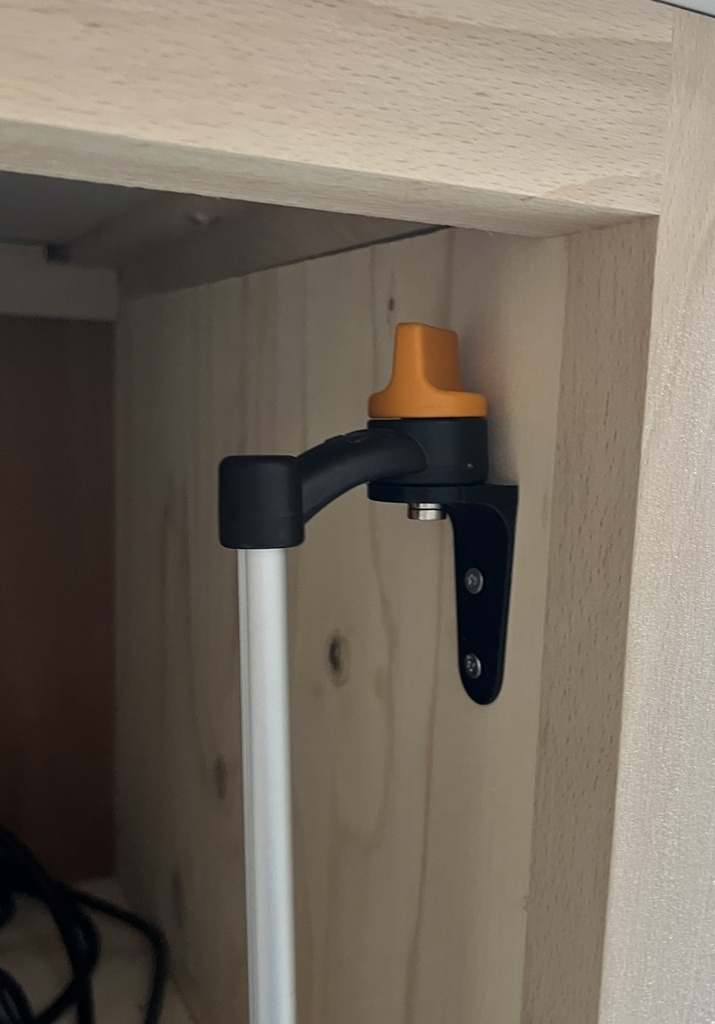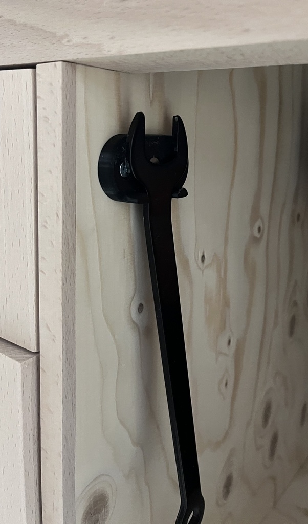 En bonus, j'ai fais en sorte que les outils courants (clef et manivelle) soient facilement accessibles via un support imprimé en 3D et comportant un aimant pour garder en place l'outil.