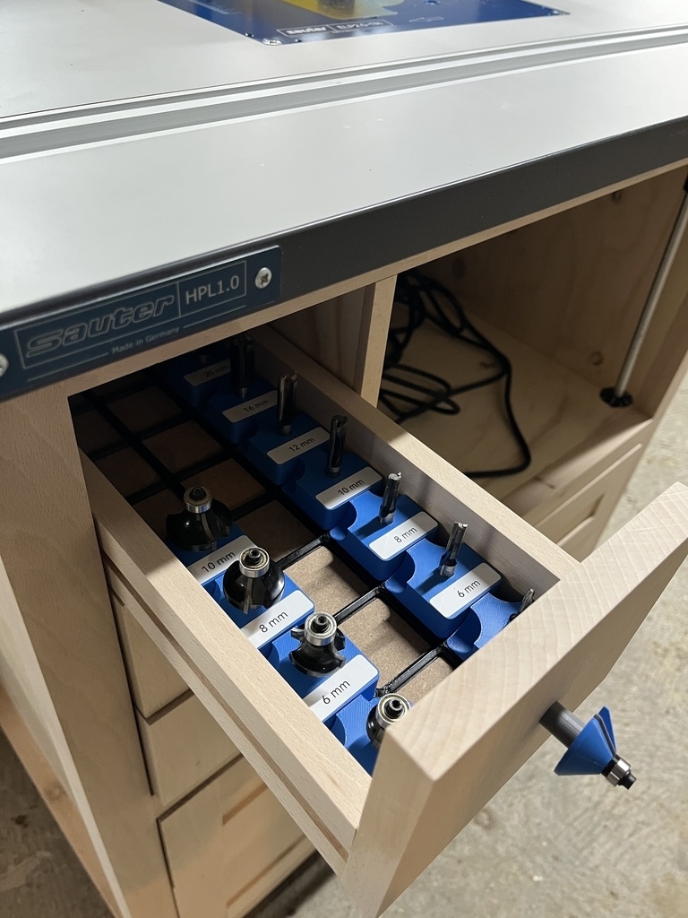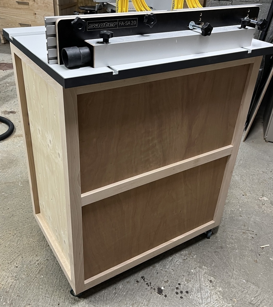 En faisant quelques recherches je suis tombé sur un kit Sauter + Triton TRA 001 (2400W) qui me plaisait bien, j'ai donc conçu puis construit un meuble roulant pour y accueillir en plus tous les accessoires de fraisage.