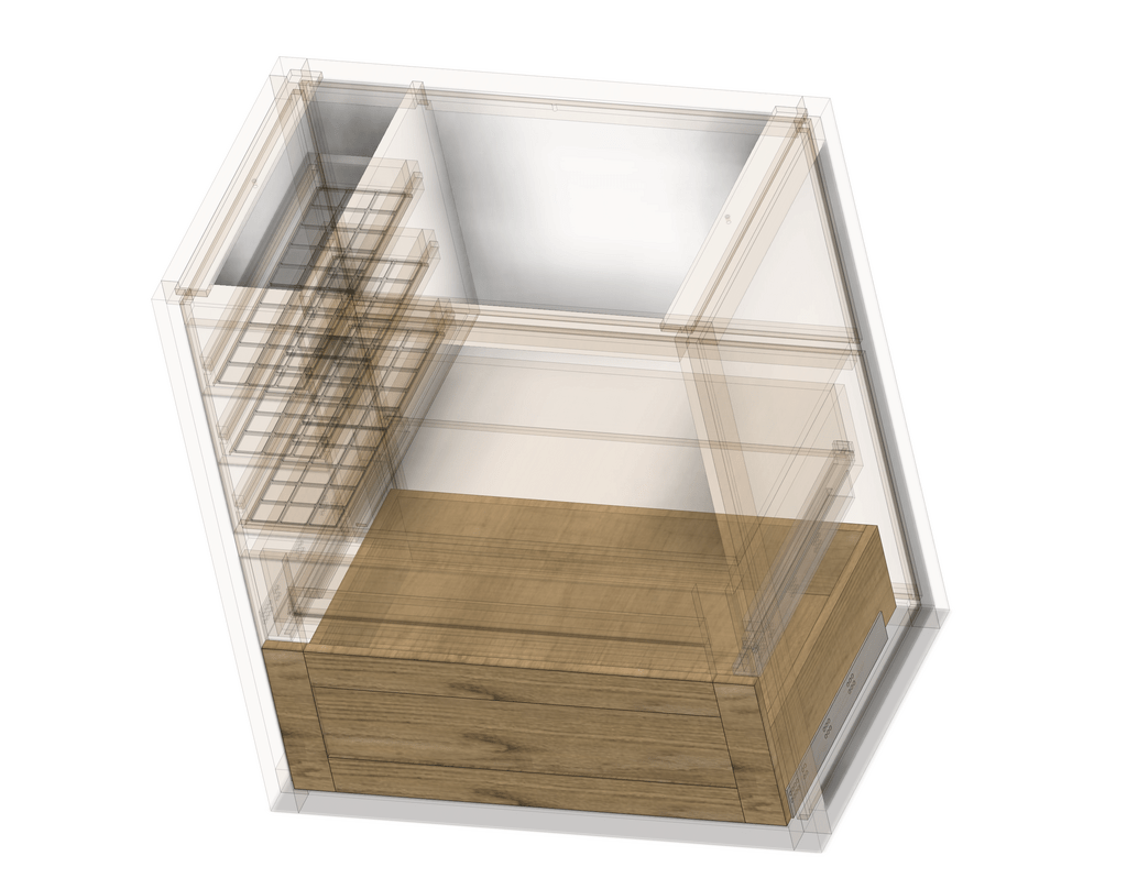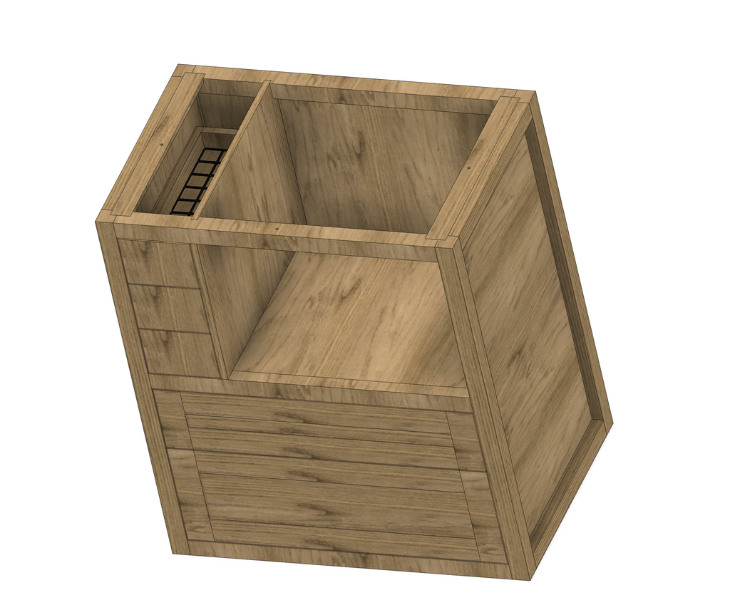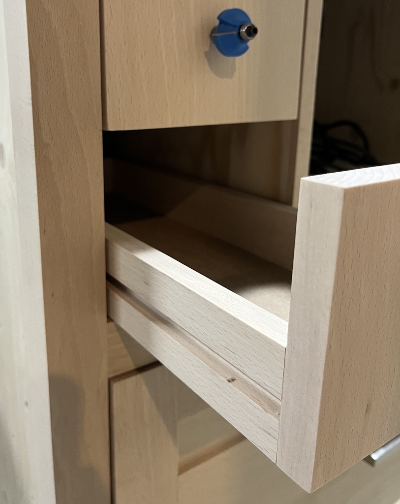 L'ensemble des usinages ont été réalisés avec la table de fraisage ce qui m'a permis de faire évoluer la conception du meuble qui initialement devait avoir 3 tiroirs de chaque côté (afin de brancher l'aspiration + faciliter la manipulation de la machine j'ai sacrifié un côté).