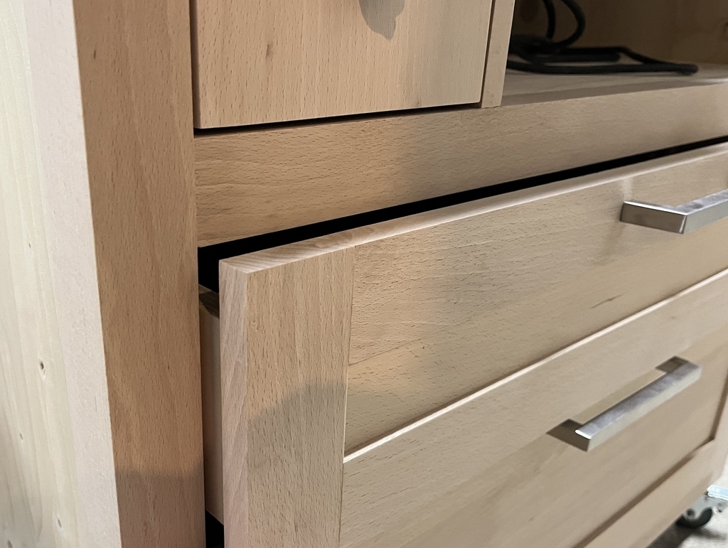 Pour les tiroirs du haut j'ai réalisé des glissières en bois, pour les tiroirs du bas j'ai pris des Tandem 450mm de chez Blum.