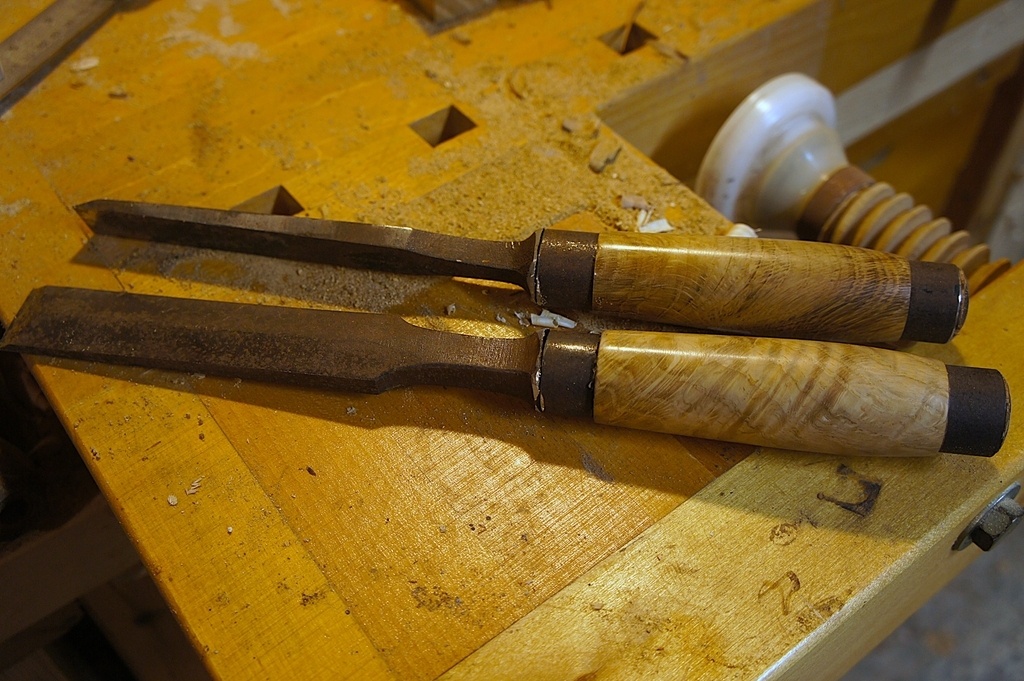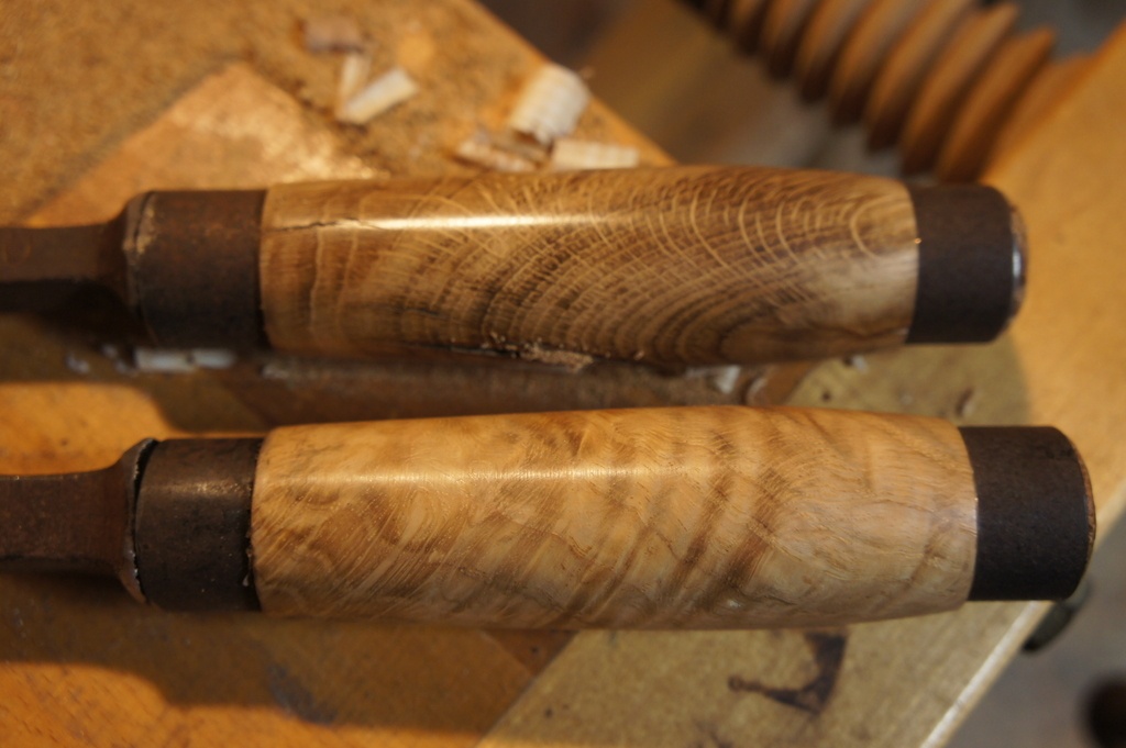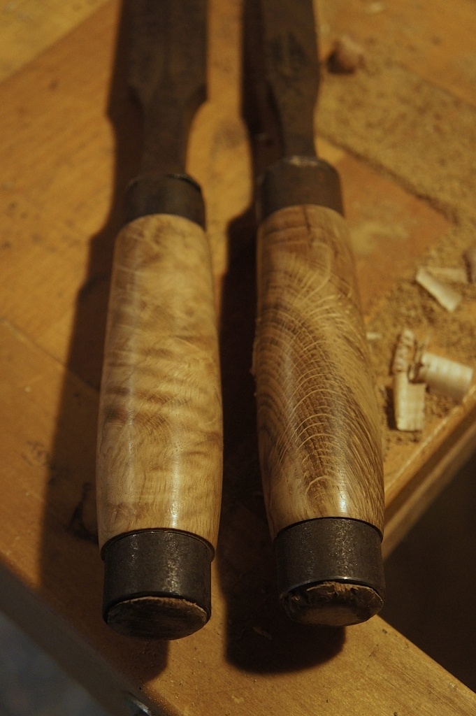 Réemmanchage de ciseaux lourds en chêne avec double virole en acier. L'idée est de pouvoir taper dessus à la massette pour bricoler de la charpente. Métal sur métal avec des ébauchoirs classiques, mes oreilles ne supportent plus.