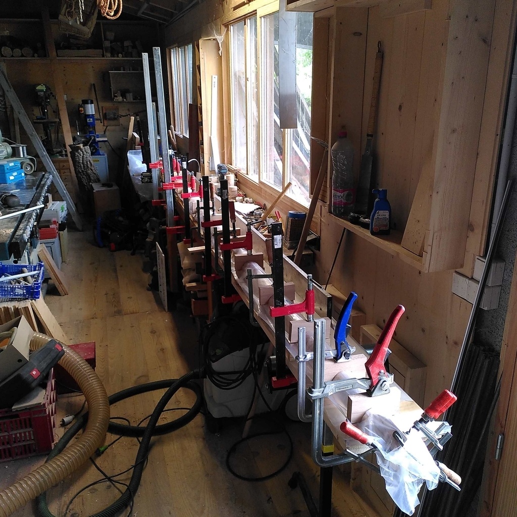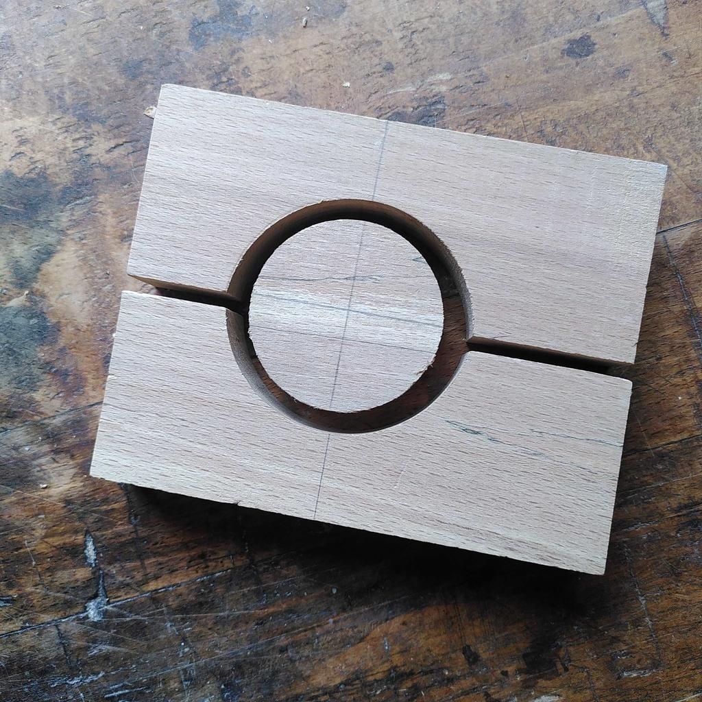 Je suis parti des chutes issues de la réalisation des cales de serrage du mât de ma yole de Ness. J'ai ajouté des carrelets rabotés à la même épaisseur (23 mm) et tronçonnés à 3 diamètres de longueur.