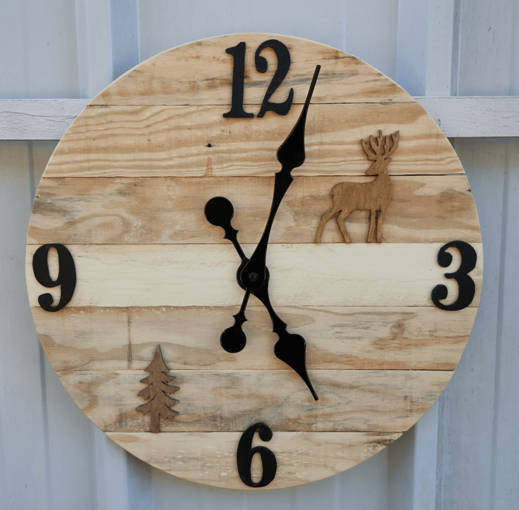 la palette , tout est en bois de palette sauf le mécanisme et aiguilles , elle fait 55 de diamètre , les chiffres sont aussi en bois de palette découpé suivant le pochoir , bonne journée
