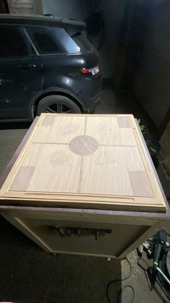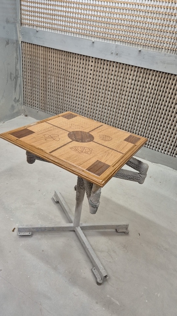 Réalisation d’un plateau de jeux de mus (jeux de carte basque ), je l´ai fabriqué sur un plateau en châtaignier assemblé par pigeon. J’ai ensuite incrusté des aimants, puis réalisé le plaquage.